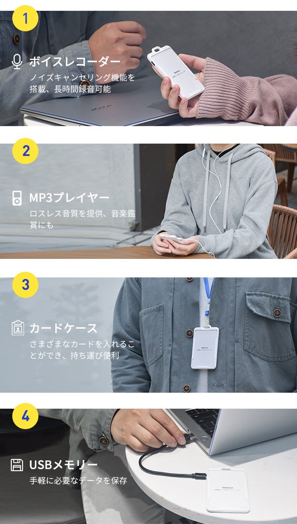 - ボイスレコーダーでありながら、カードケース・MP3プレイヤー・USBメモリとしても大活躍!