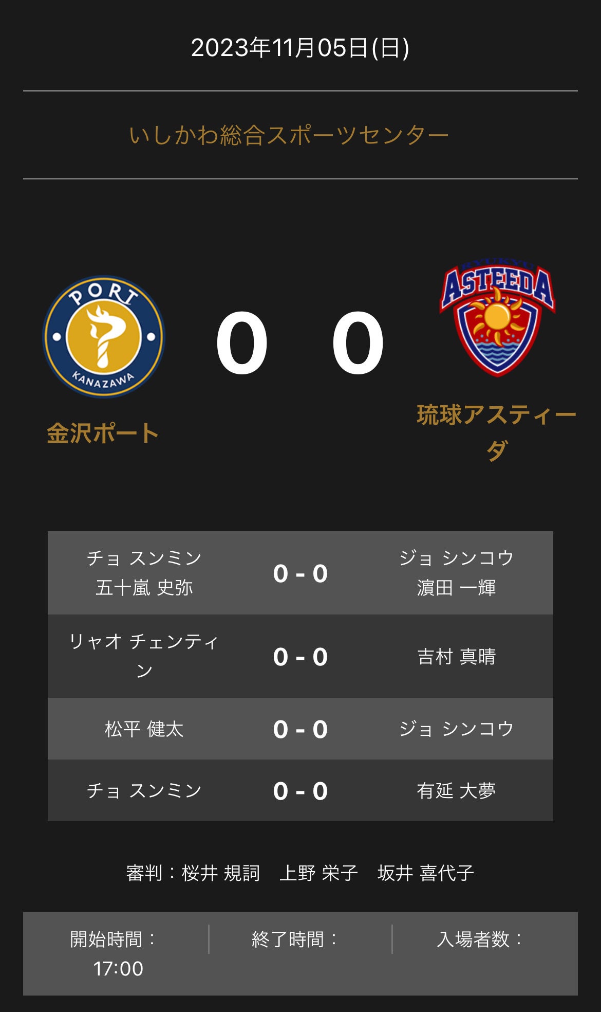 ノジマTリーグ2023-2024シーズン公式戦 11月5日(日) 金沢ポート vs琉球アスティーダ 対戦オーダー発表