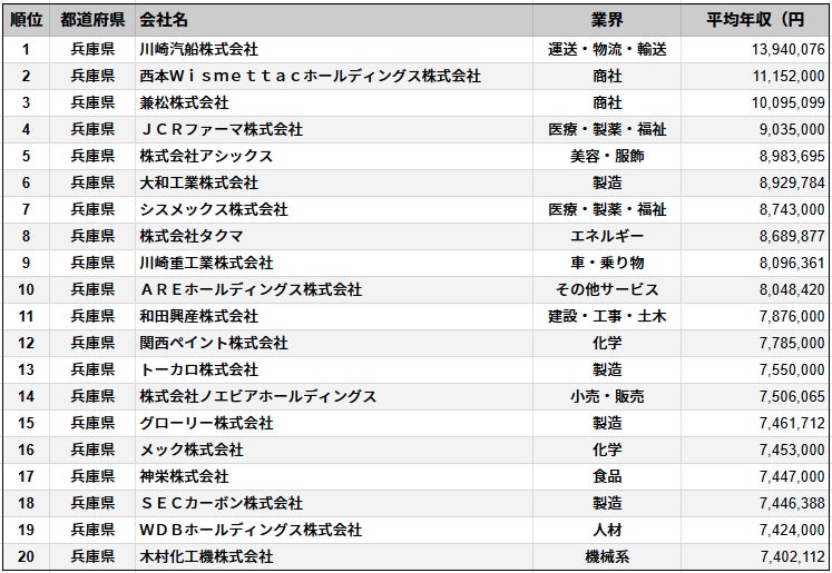 株式会社SalesNow(本社:東京都渋谷区、代表取締役:村岡功規、以下「当社」)は、国内540万社の企業情報を完全網羅した日本最大級のデータベース「SalesNow DB」より、上場企業を対象に兵庫県に本社を置く企業の平均年収データを集計・分析し、「平均年収ランキング」として公開いたしました。