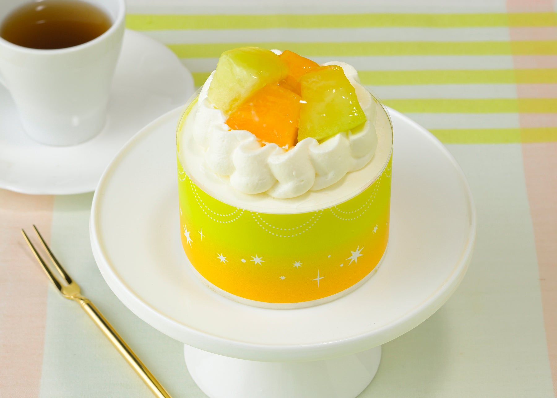 特長:茨城県産の濃厚な甘みと芳醇な香りの「赤肉メロン」と、爽やかな甘みと香りの「青肉メロン」。2種類のメロンを味わえる、ひとりじめサイズのデコレーションケーキです。ふわふわのメロン風味スポンジで、メロンと相性の良いチーズ風味クリームをサンドしました。チーズ風味クリームのまろやかな酸味がメロンの甘みとみずみずしさを引き立てます。