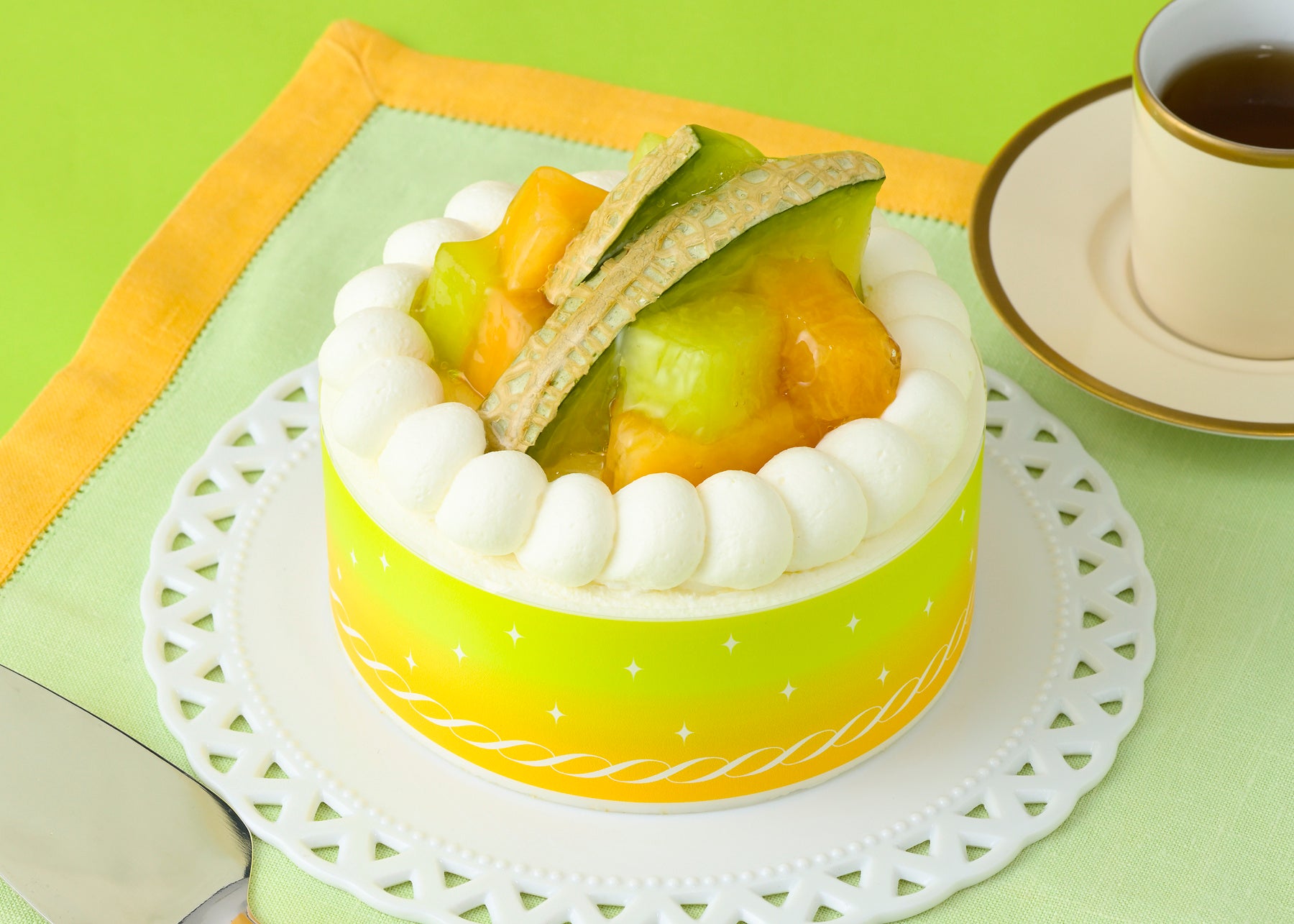 特長:「赤肉メロン」と「青肉メロン」、2種類のメロンを味わえるデコレーションケーキです。ふわふわのスポンジで、程よい甘さの練乳クリームと、メロンとりんごのジャムをサンド。上面にはコクのある生クリーム入りホイップクリームと、メロンをボリュームたっぷり飾りました。メロンのとろけるような甘みが際立つ、クリーム&スポンジ仕立てのシンプルな味わいをお楽しみください。