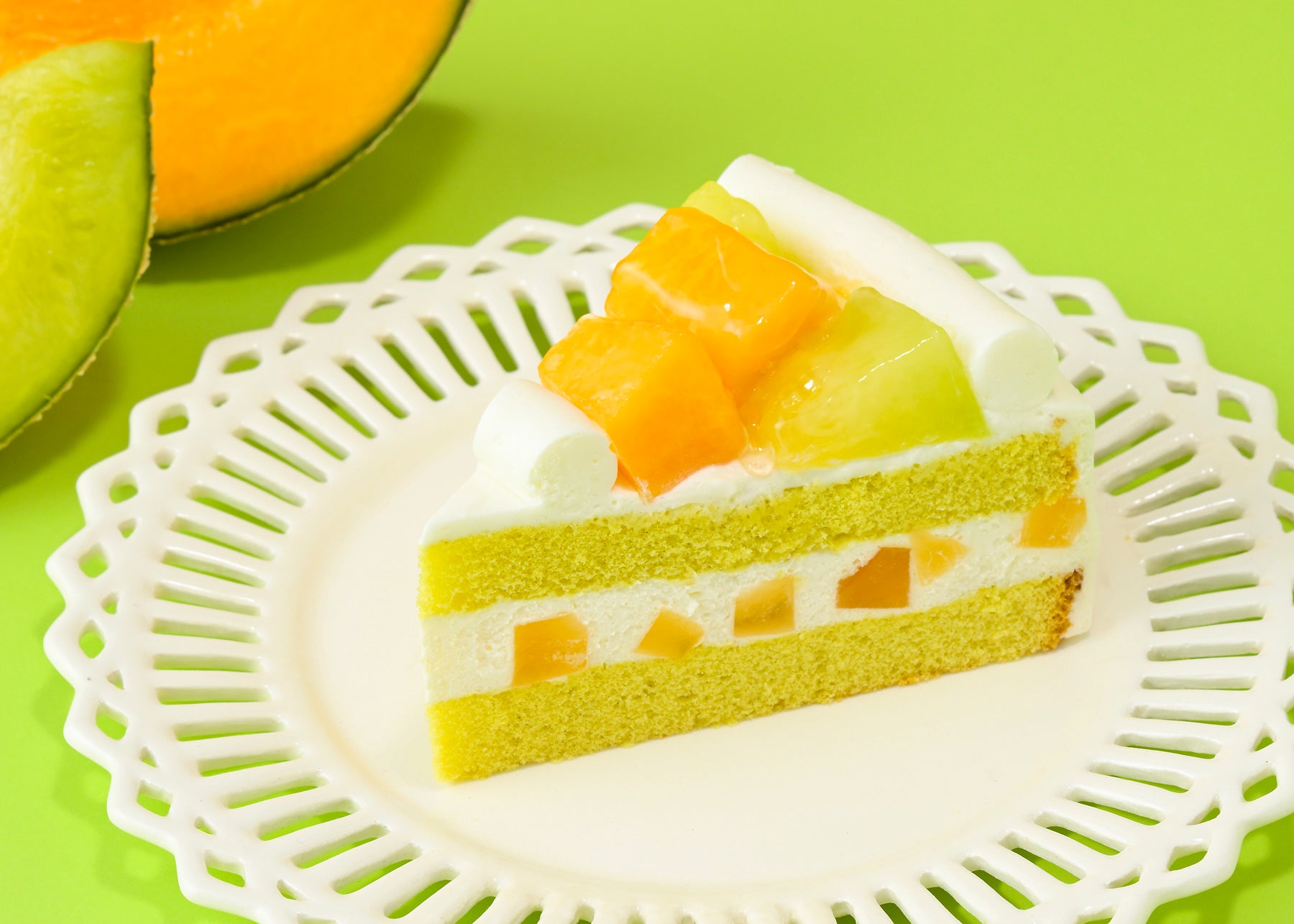 濃厚な甘みと芳醇な香りの「赤肉メロン」と、爽やかな甘みと香りの「青肉メロン」、2種のメロンのおいしさを1つのケーキで味わえるのが特長です。