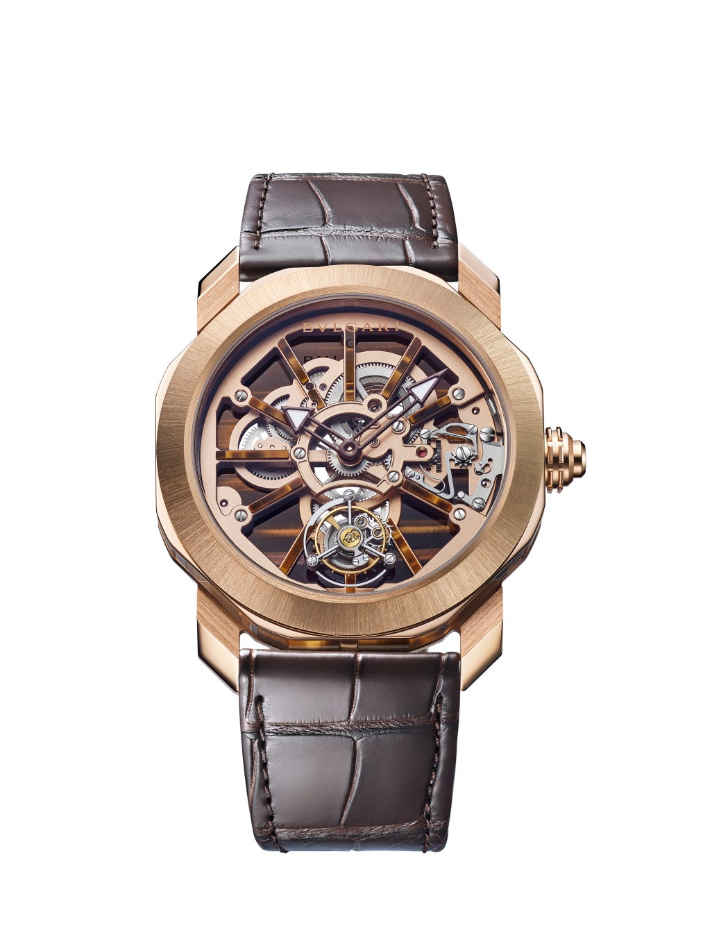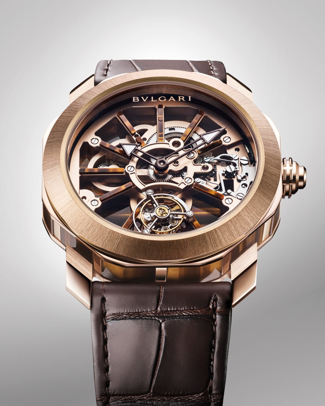 さまざまな複雑機構を可能にする「オクト ローマ」の設計は、ブルガリの卓越したオートオルロジュリーを魅せるプラットフォームとしての役割を担っています。目を奪う美しい佇まいを持ち緻密に作動する機構を有するトゥールビヨンはウォッチメイキングにおけるブルガリが持つ卓越性を真に物語るタイムピースです。トゥールビヨンの魅惑的なムーブメントやダイヤルに施された繊細なディテールなど各モデルに搭載されたそれぞれの機能を壮麗に示しています。