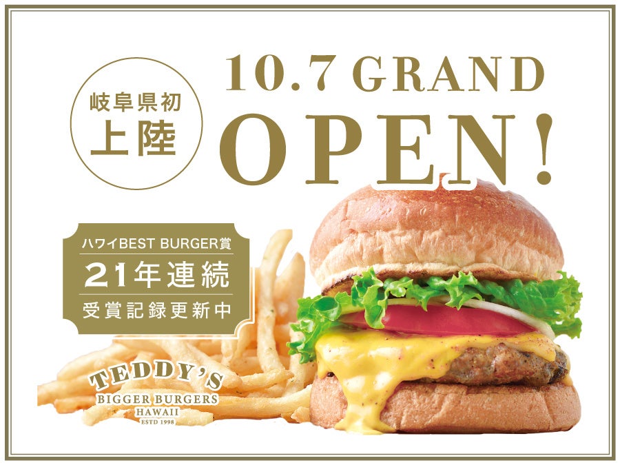 21年連続ハワイベストバーガー賞受賞中の「テディーズビガーバーガー(TEDDY'S bigger burgers)」が、2022年、岐阜県イオンモール土岐に、新店舗をオープン。