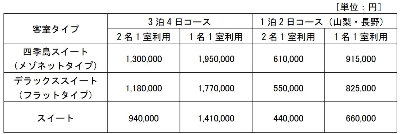 多くのお客さまからご好評をいただいている、「3泊4日コース/春」、「1泊2日コース(山梨)/春」「1泊2日コース(長野)/春」の3つのコースを継続して設定します。