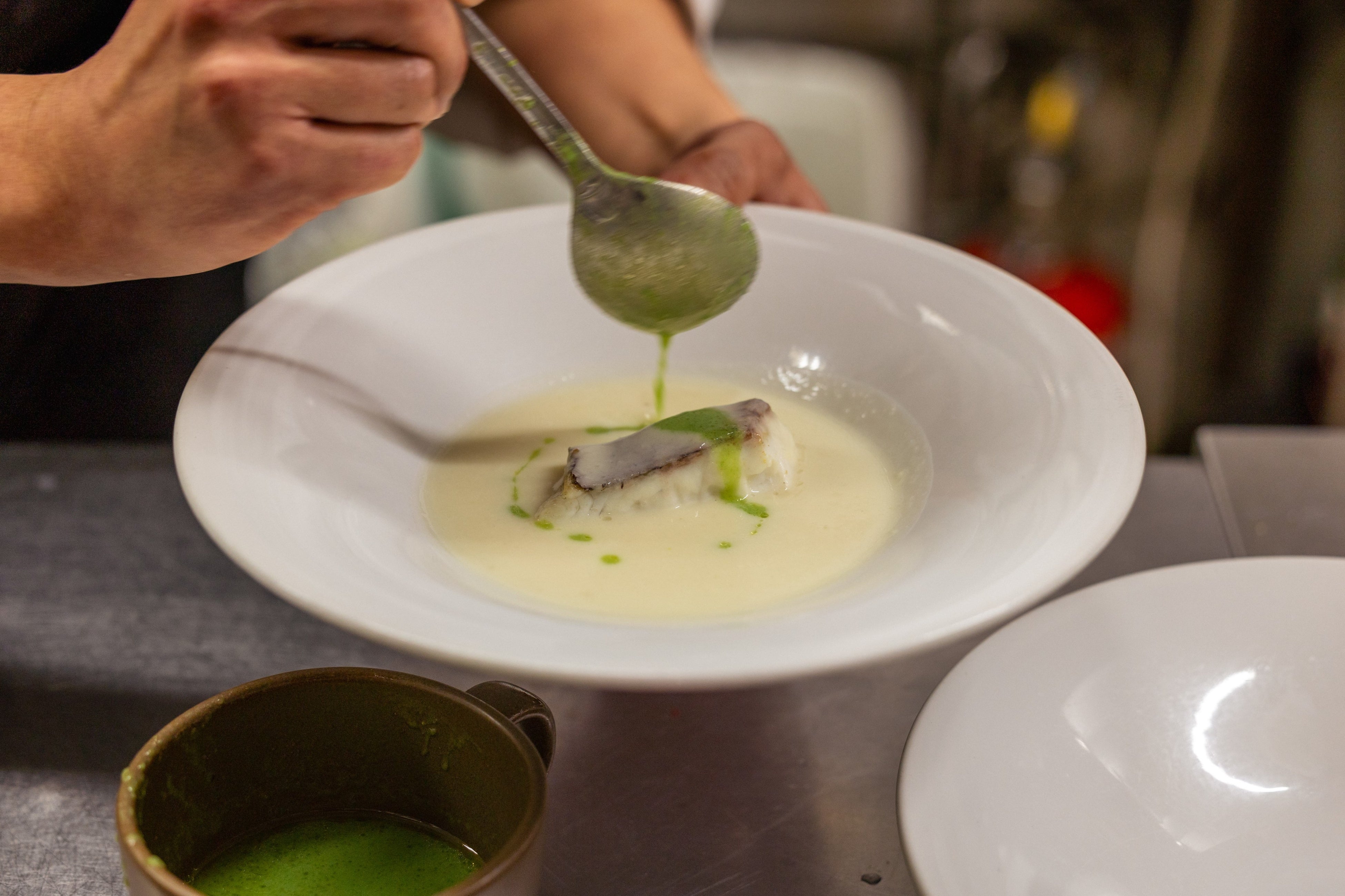 【魚料理】×白ワイン:桜鯛 浅利と新玉ねぎ、新じゃがいものフリカッセ グリンピースピューレ