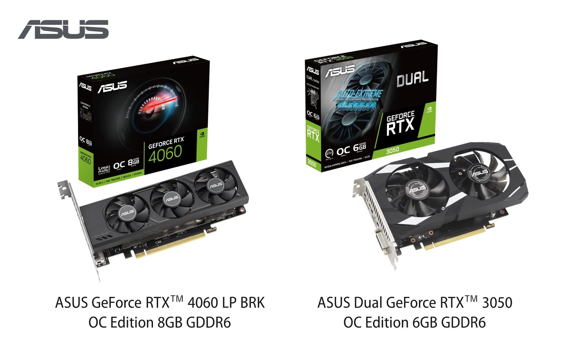 ASUS JAPAN株式会社は、NVIDIA GeForce RTX™ 4060搭載ビデオカード「RTX4060-O8G-LP-BRK」、NVIDIA GeForce RTX™ 3050搭載ビデオカード「DUAL-RTX3050-O6G」を発表しました。