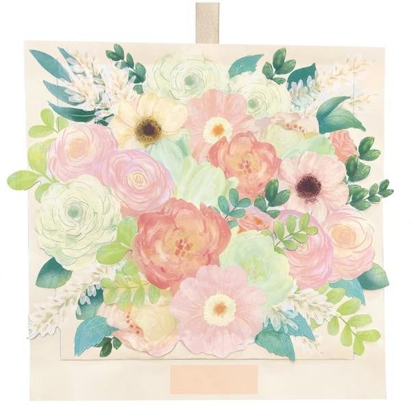 上部のリボンを引くとモチーフが立ち上がり、メッセージが現れる見た目も楽しい仕掛けの色紙。