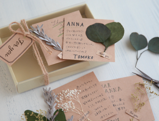 写真やプチギフトも入るボックスタイプ。付属のカードにプリザーブドリーフを添えて個性的な仕上がりに。