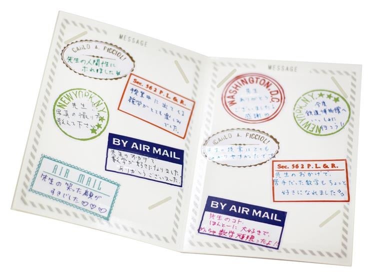 新たな旅立ちにぴったりのパスポートそっくりな色紙です。写真を貼れる身分証明欄や入国スタンプ型のメッセージシールなど遊び心あふれる内容で門出を祝います。