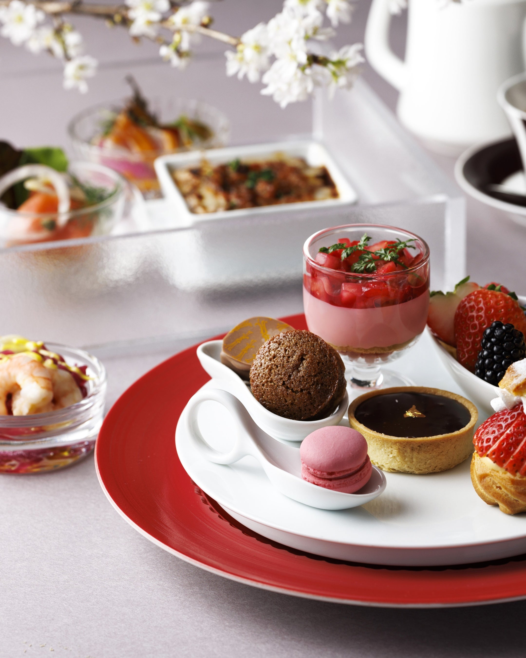 下から薄いピンクの桜風味パールクラッカン、ふんわり甘じょっぱさが広がる桜風味ジョコンド(アーモンド生地)に、甘酸っぱいいちごムースがふわっと重なり、さらにフレッシュいちごのマセレ(シロップ漬け)をトッピングした美しい4層のグラスデザート。
