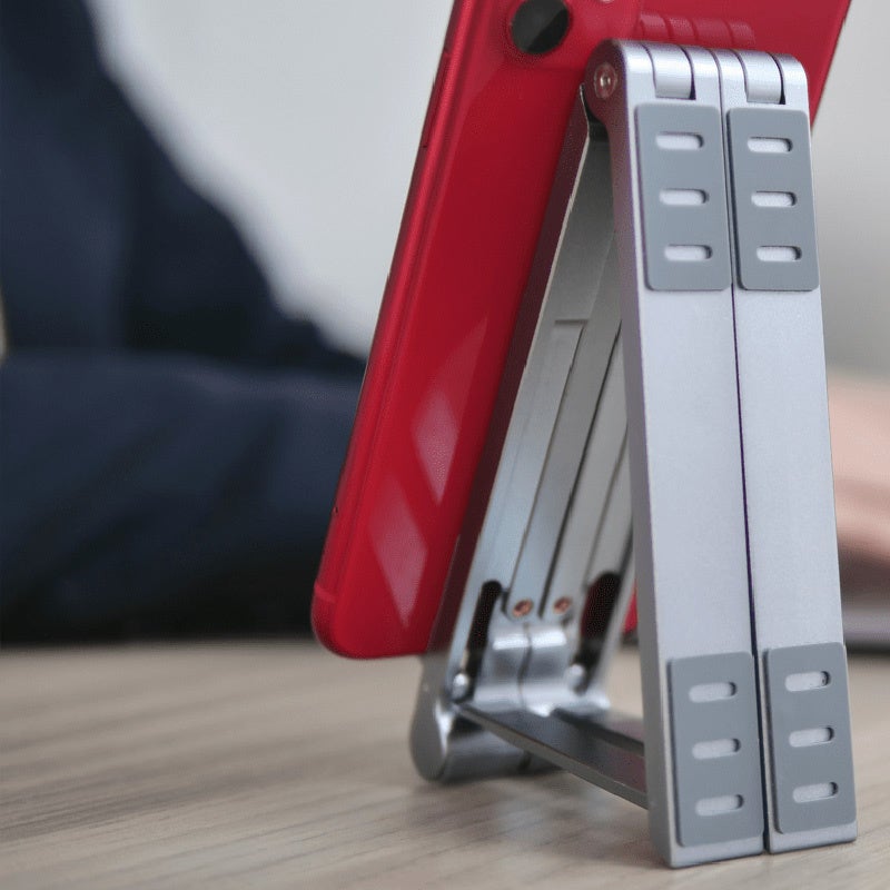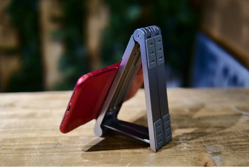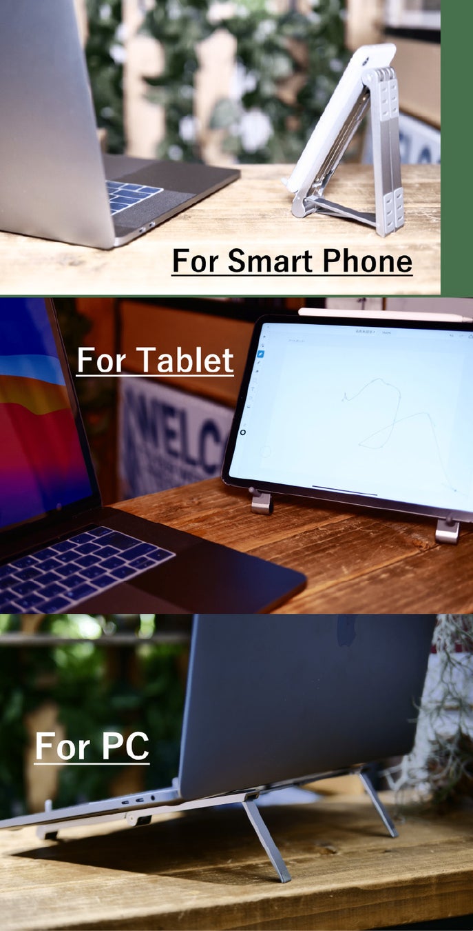 折りたたんだ状態から一瞬で広げられ、スマホ↔タブレット↔パソコン用のスタンドに早変わり!