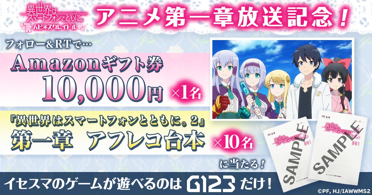 『異世界はスマートフォンとともに。2』のTVアニメ放送開始に伴い、「イセハピ」公式Twitterでは、フォロー&リツイートキャンペーンを実施致します。抽選で10名様にアニメアフレコ台本、1名様にAmazonギフト券1万円分をプレゼントいたします。キャンペーンには毎日参加が可能で、以降も様々なキャンペーンを実施してまいりますので、ぜひ公式Twitterのフォローをお願い致します。