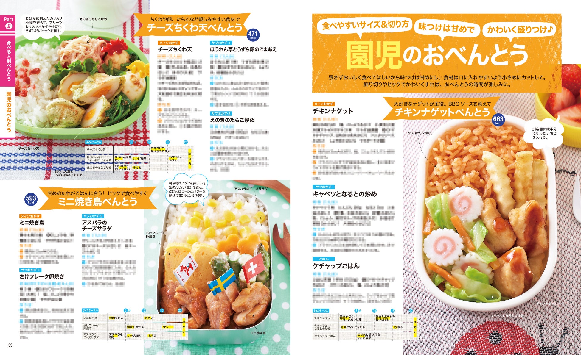定番のおべんとう人気ランキングBest10のほか、園児用、中高生用、パパ用、自分用など、食べる人別のおべんとう例、1週間保存できる作りおき、食材別・色別のおかずカタログなど、初心者でも簡単に作れて、家族みんなが喜ぶレシピ600品を一挙に紹介!