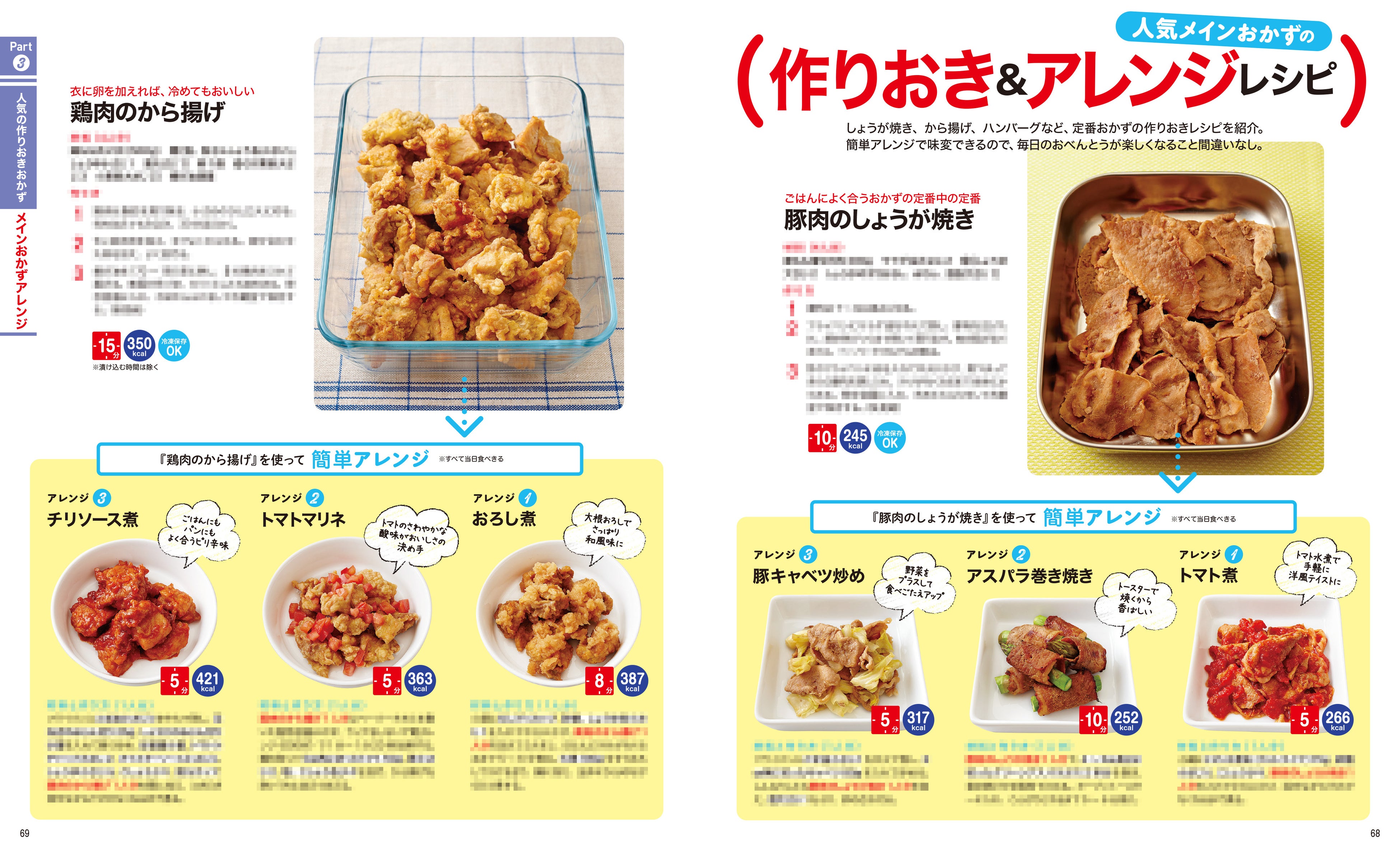 Part3では1週間保存できる人気の作りおきおかずを提案します。しょうが焼き、から揚げ、ハンバーグなど。みんなが大好きなおかずを作りおきしておべんとうに。どれも冷めてもおいしく安心して1週間保存できる工夫が盛りだくさん。味を変えたバリエーションもあるので飽きずに楽しめます。