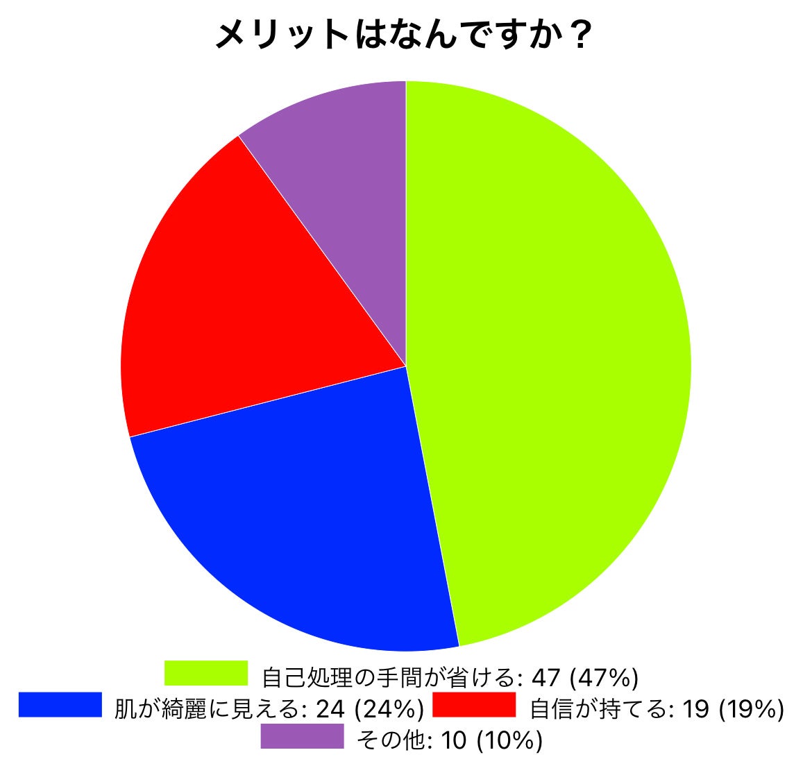 毎朝のひげ剃りなどでお悩みの方や範囲の広い足を毎日剃っていた方が多かったので自己処理の手間がなくなり満足している方が多いことがわかりました。