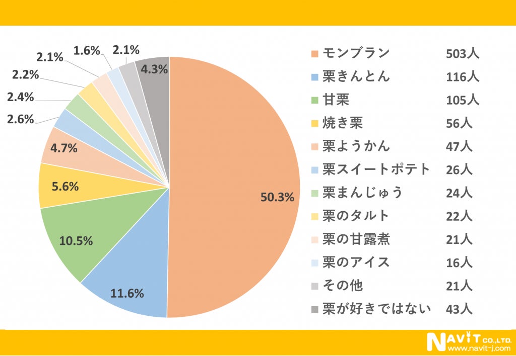 栗を使ったスイーツの中で1番人気があったのは「モンブラン」で50.3%と実に過半数を占めています。次に和菓子の定番が続きます。「栗きんとん」が11.6%で「甘栗」が10.5%となっています。