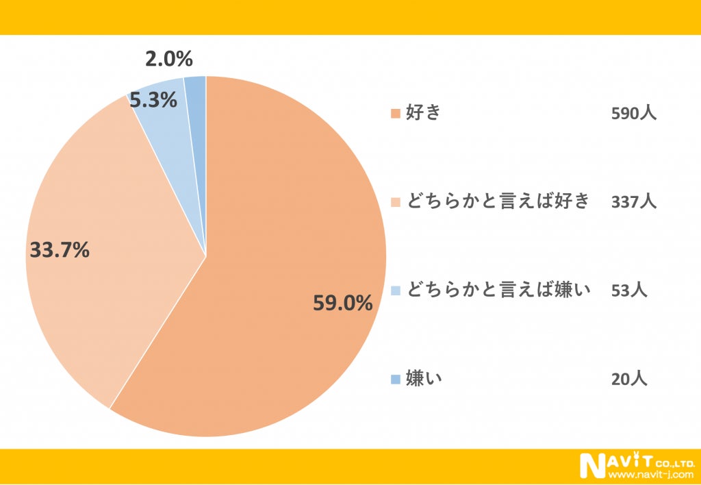 栗が「好き」という方が59.0%で過半数をしめています。また「どちらかと言えば好き」という方と合わせると92.7%と大多数の方が栗を好きだという回答をしています。