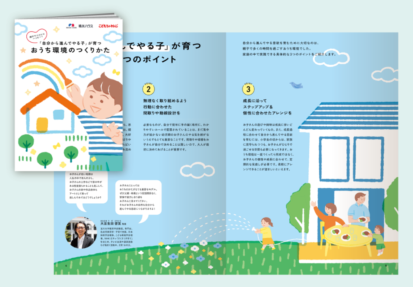 こうした状況を踏まえ、「こどもちゃれんじ」は積水ハウスと、子育て家庭に快適な住環境を通じて、お子さまの成長・学び・健康や、家族の幸せな時間を応援したいという想いで、共同企画の実施を決定しました。ファミリー世代の「幸せ住まい」を様々な技術で提供してきた積水ハウスの知見と、親子で楽しく生活習慣や学力の素地を身につける「こどもちゃれんじ」の知見を活かし、子どもの自主性を育み、家族のコミュニケーションが活発になる家づくりについての情報誌を制作。例えば、着替えや片付けなどの生活習慣や学習習慣は、お子様の発達にあわせて間取りや導線など住環境を整えることで、お子さん自ら取り組む姿勢や「できた!」自信を育むことが可能です。おうちの方が注意をしたりイライラしたりすることが減り、親子共にハッピーに過ごせるヒントを掲載しています。お子さま向けシールボードでは、おうちのさまざまな設定を取り入れたごっこ遊びを楽しむ中で、親子の会話を広げながらおうちで過ごす楽しいシーンをイメージできるよう設計しています。