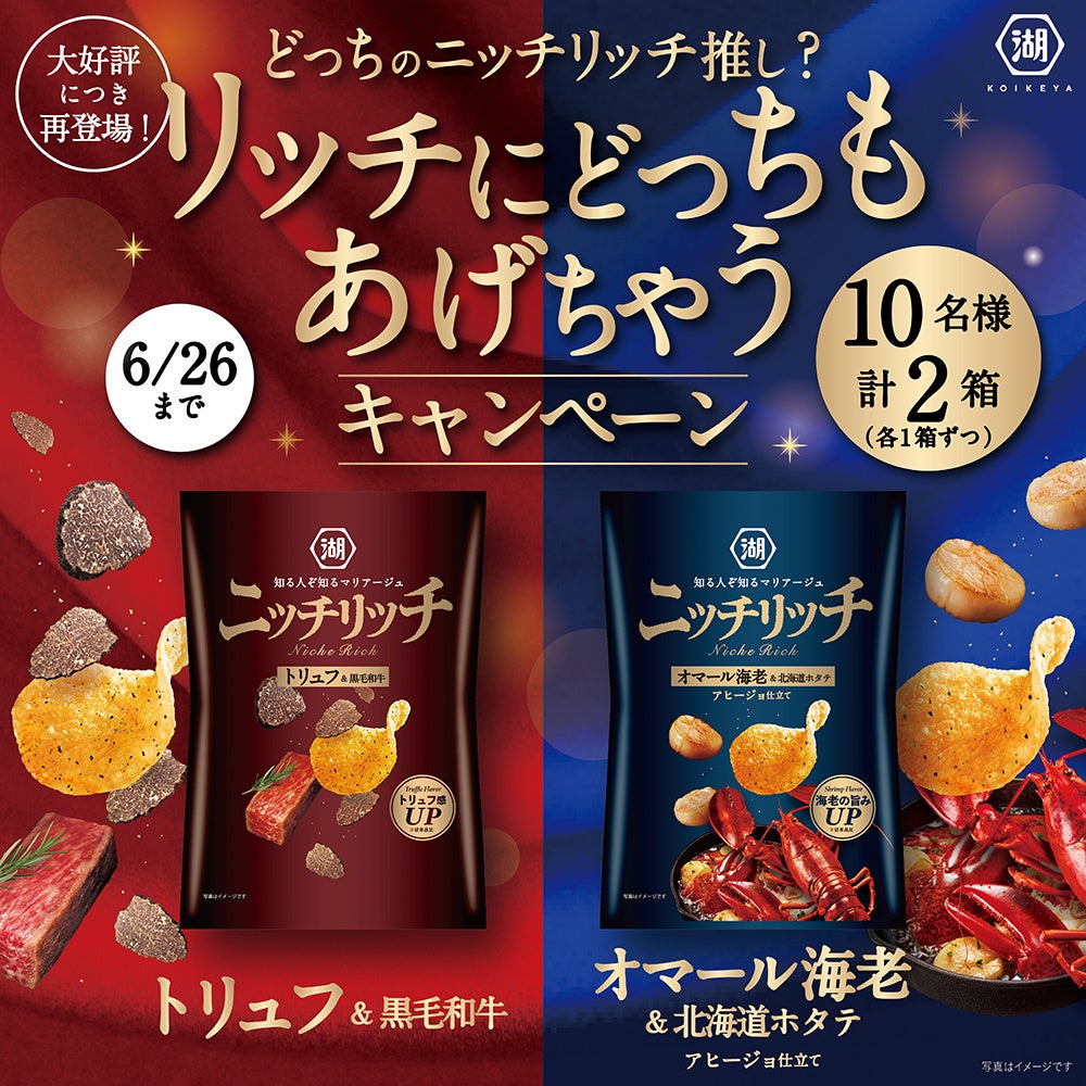 大好評につき再登場した「ニッチリッチ」のリニューアル発売を記念し、新しくなったニッチリッチ2品をセットにしてプレゼントするキャンペーンを実施します。美味しく進化した「トリュフ&黒毛和牛」「オマール海老&北海道ホタテ アヒージョ仕立て」がセットで各1箱(12袋)当たるこのチャンスに、ぜひご応募ください。