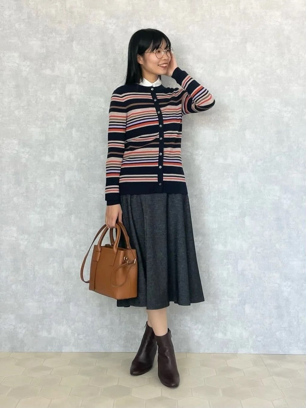 存在感のあるマルチボーダー柄ニットを主役に。締め色のネイビーを効かせた配色で、多色使いながら品よく着こなせるアイテムです。シンプルなホワイトシャツを重ねることで、クリーンな印象をプラス。程よく広がるフレアスカートを合わせれば、メリハリのあるスタイリングに仕上がります。