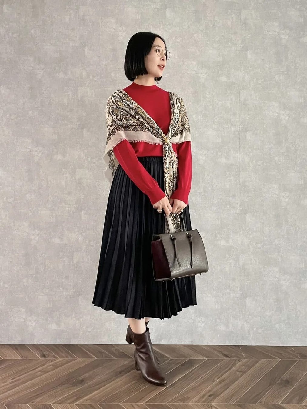 カラーニットとダマスク柄ストールを合わせて、顔周りを華やかに。ハイネックのニットは襟位置が高すぎないデザインで、すっきり着こなせるのがポイントです。存在感のある大判ストールは、少し肩の位置を落としてラフに羽織ると◎全体を引き締めてくれる深いネイビーのプリーツスカートを合わせれば、上品なカジュアルスタイルが完成します。
