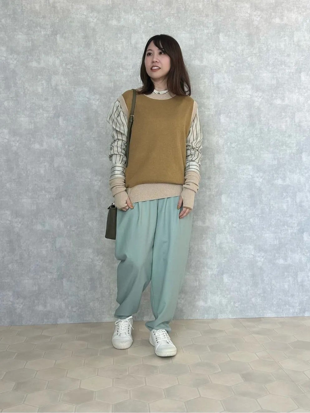 ニットベストとシャツをレイヤードして暖かに。ベストに付属のアームウォーマーをプラスすれば、堅い印象にならずトレンド感のある着こなしが完成します。ボトムはサックスブルーのパンツで、あえてコントラストを付けた配色がポイント。ゆったりとしたシルエットの、見た目も着心地もリラクシーなスタイリングです。