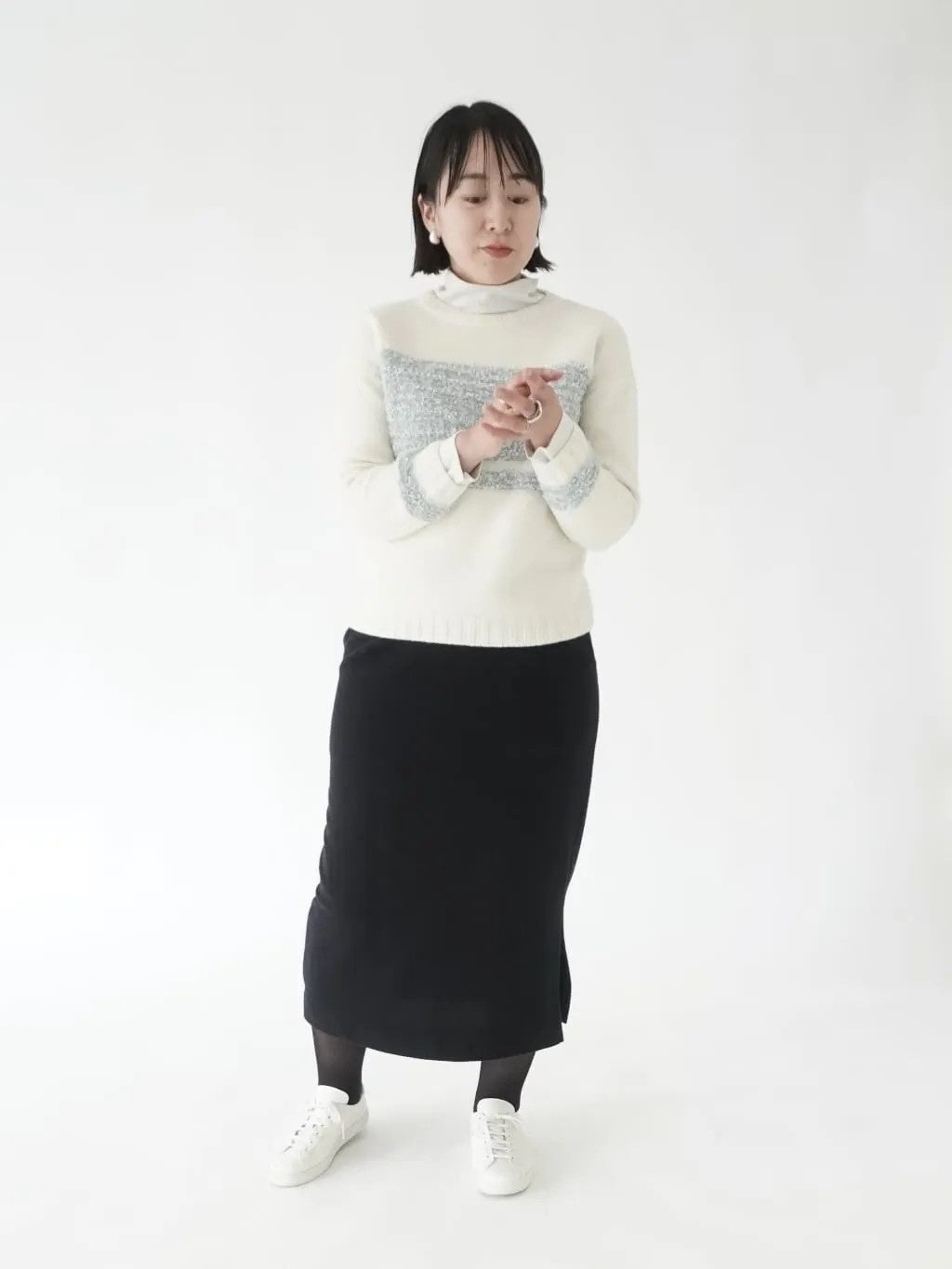 モノトーンをベースにした、大人な表情のリラックススタイル。ニットはリボン状の糸とループヤーンをミックスした、ボーダー状の柄がポイントです。ボトムはニットのデザインが引き立つブラックのスカートをチョイス。セミタイトのシルエットが、ふんわりとしたニットとの組み合わせをすっきり見せてくれます。