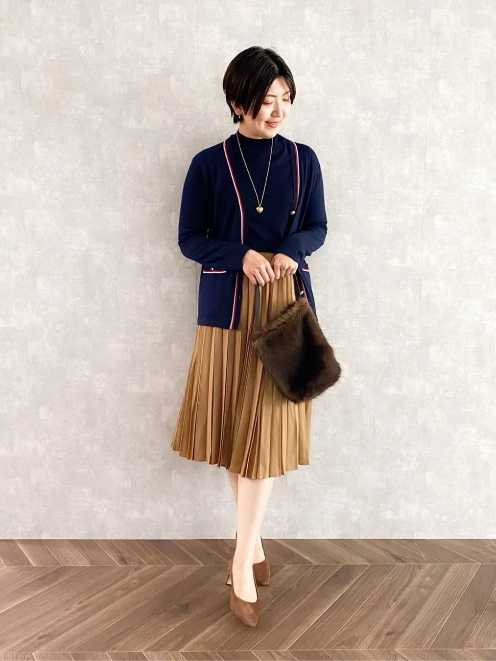 ネイビーのニットアンサンブルにプリーツスカートを合わせて、オンオフどちらのシーンにもマッチする上品トラッドスタイルに。カーディガンは、ゆったり羽織れる長めの着丈で着心地快適。プルオーバーのみ裾をタックインすると、ウエスト位置が高く見えてスタイルアップも叶います。小物は深みのあるブラウンでシックにまとめました。