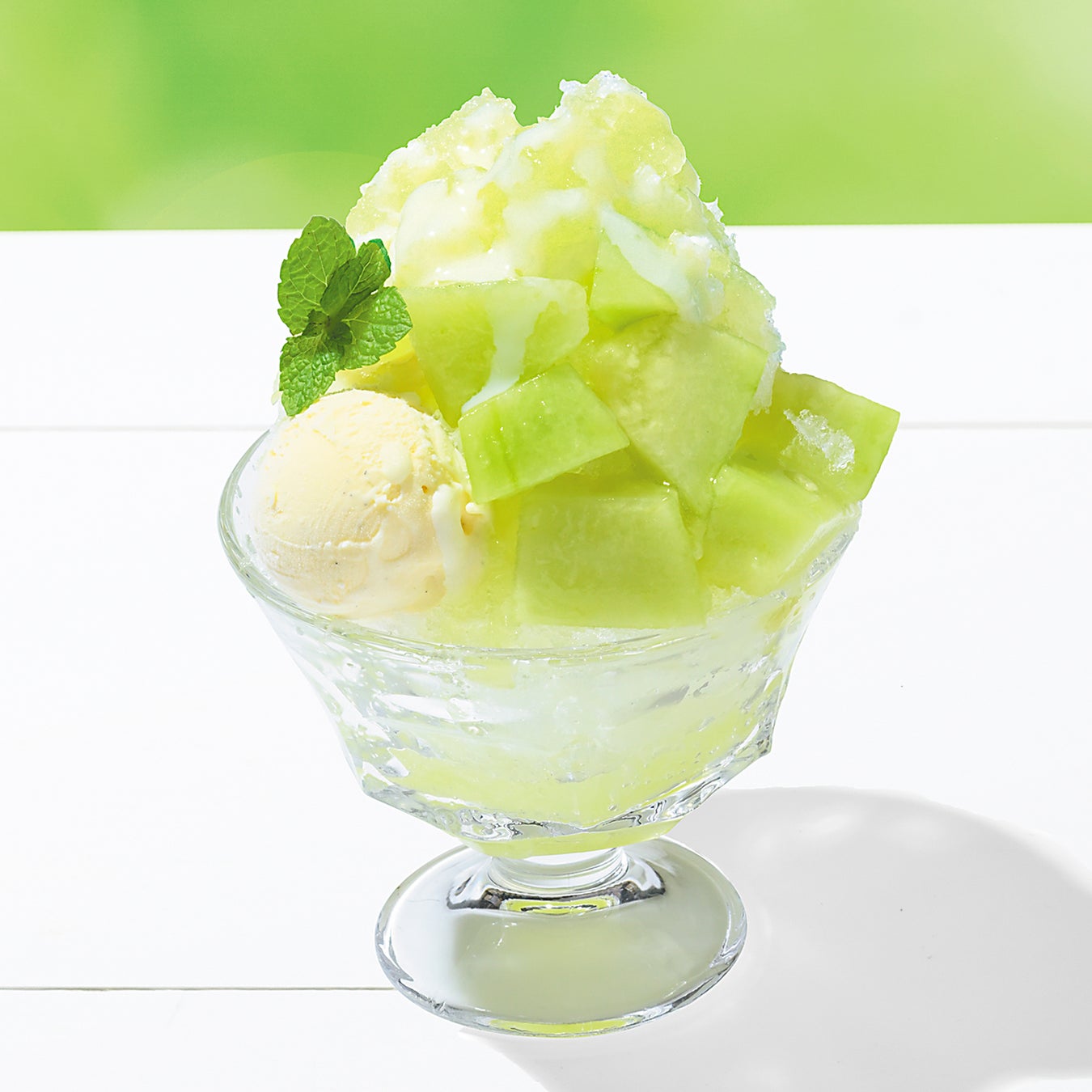 特長:レトロチックなグラスにふんわりと削ったかき氷を盛り、メロンの果肉をごろごろっとのせ、バニラアイスを添えました。仕上げは香りが高く旨みも強いメロンシロップとコンデンスミルクで。夏にうれしい冷たさと、まろやかな味わいをお楽しみください。