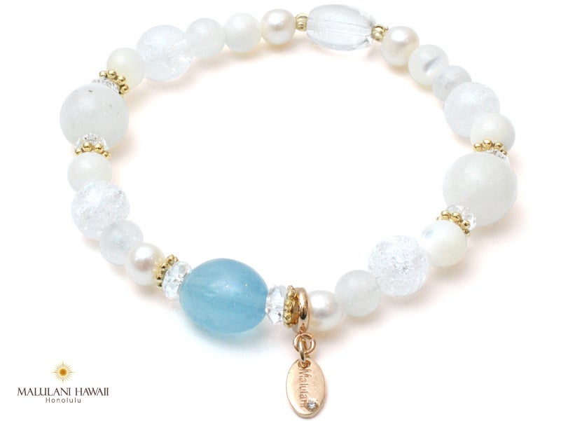 穏やかで優しく、すっきりとした波動の石を組み合わせた、ホワイトとブルーが涼やかなブレスレット。