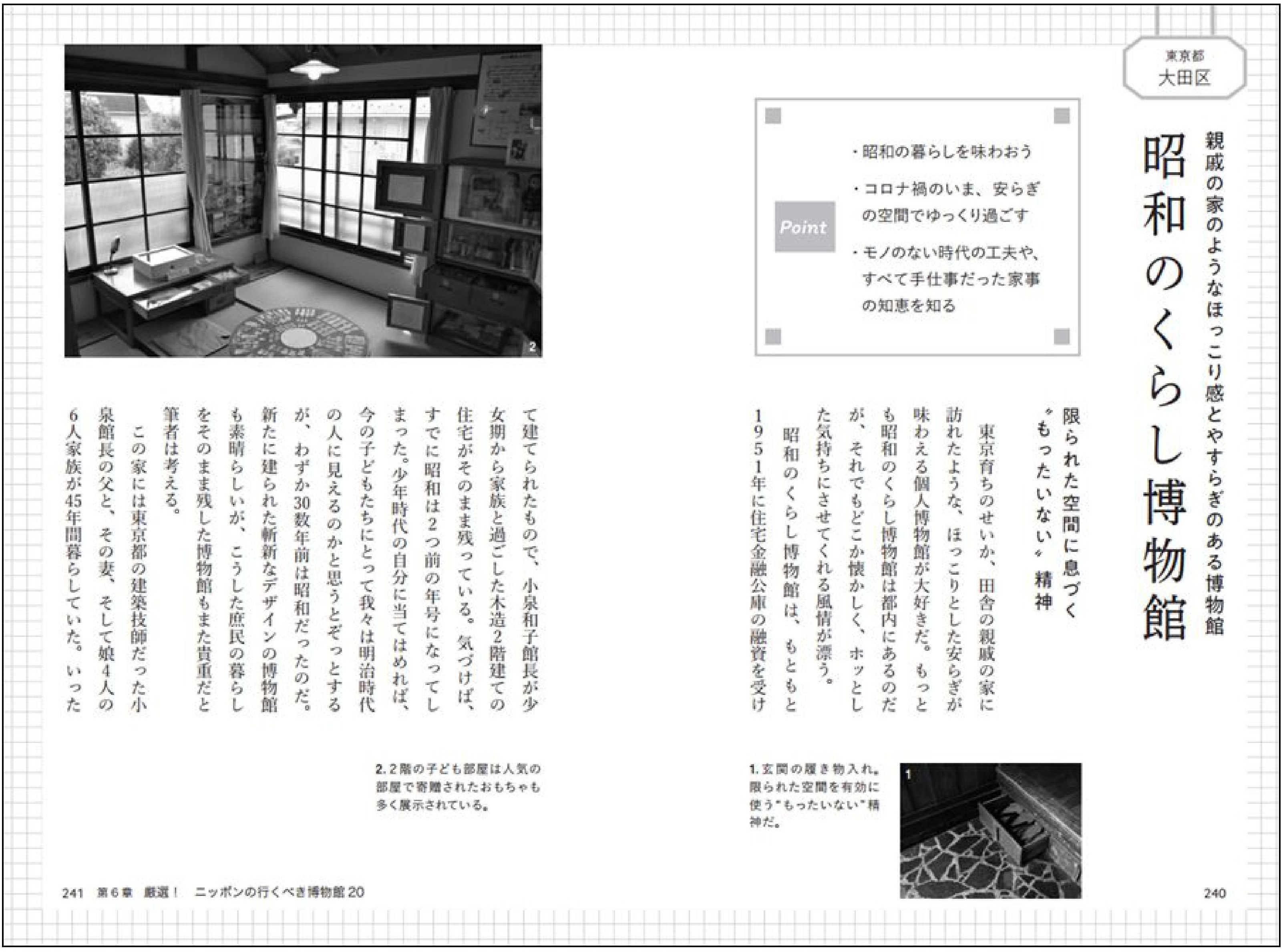 巻末は「厳然! ニッポンの行くべき博物館20」。北は北海道から南は沖縄まで、著者が悩んで選び抜いたオススメの博物館を20館ガイドしています。正統派のガイドブックでは、名品、名画を持っていたり、有名建築家による建物だったりを紹介するところですが、本書では、著者独自の視点で、後々まで印象に残る、こだわりと特色をもった博物館が選ばれています。多少不便な場所にある意外な博物館も掲載されているので、旅の目的地として計画するのも楽しいでしょう。