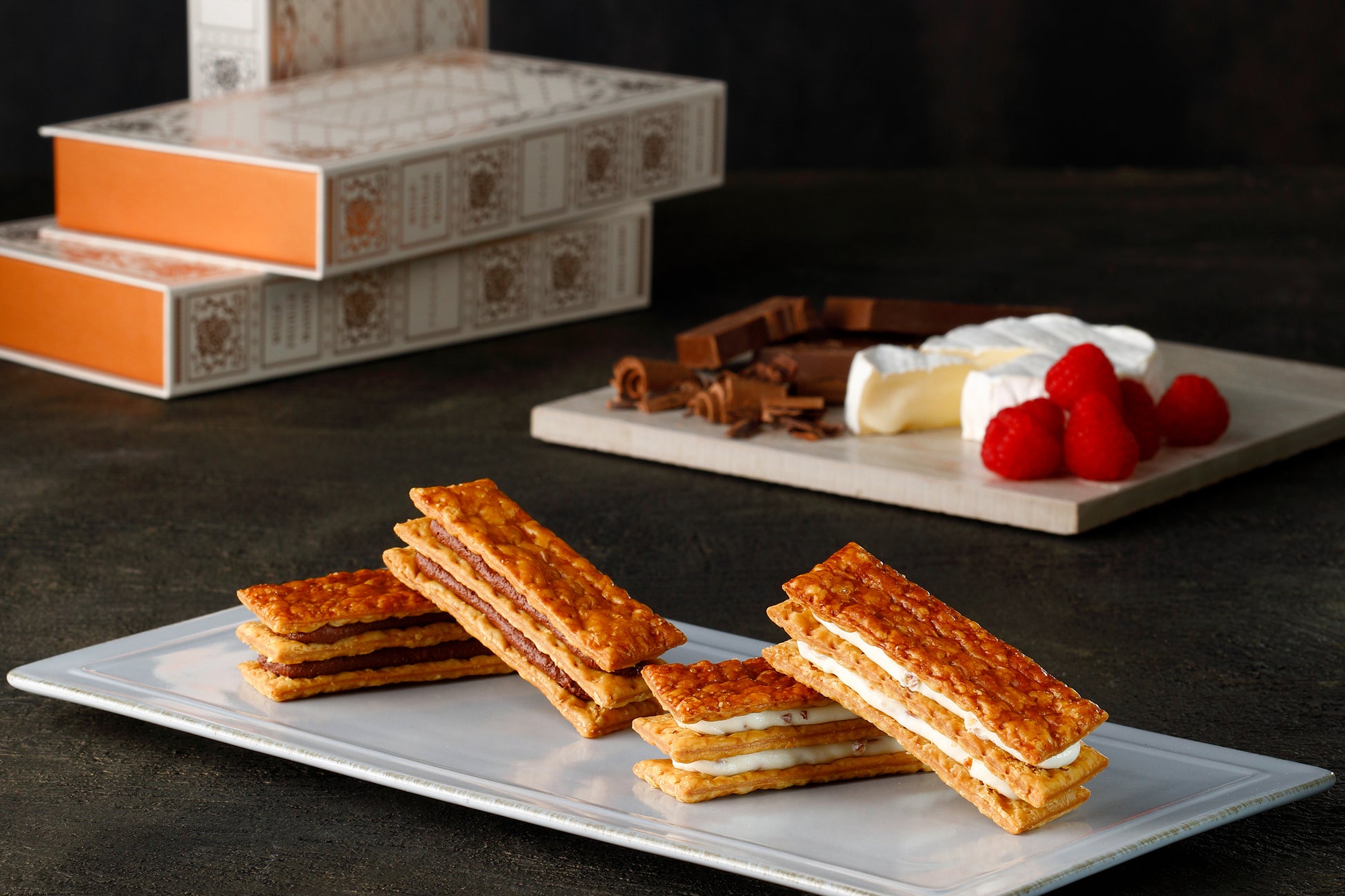 “サクッ”とした食感が特徴のこだわりのフィユタージュに、カマンベールチーズの風味とアーモンドダイスと塩味が特徴のクリームをサンドした「カマンベール」味と、甘さひかえめのビターチョコレートと甘酸っぱいフランボワーズがアクセントのクリームをサンドした「フランボワーズノワール」味、2種類をお楽しみいただける詰合せです。