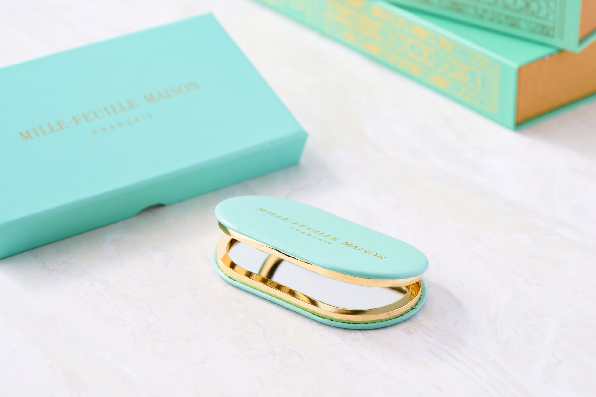 税込12,000円以上お買い上げのお客様に、ミルフィユメゾンオリジナルのコンパクトミラーをプレゼント。オリジナルの巾着と箱が付属しており、特別感溢れる仕様となっております。