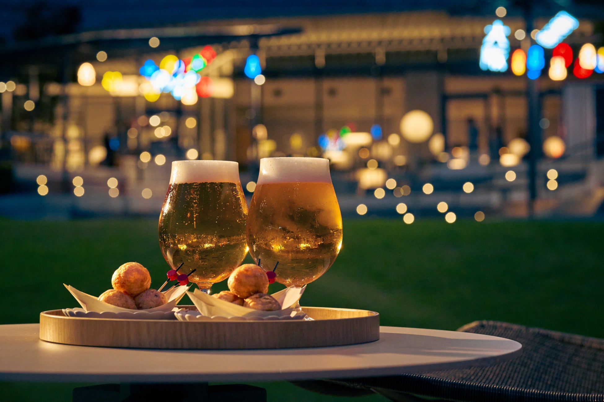 ガーデンエリア「みやぐりん」にて、大阪をテーマにした「なにわネオンアート」の装飾を眺めながら、浴衣でそぞろ歩きを楽しむイベントです。たこ焼き発祥のお店「会津屋」の職人による焼きたてのたこ焼きや、大阪の醸造所で作られたクラフトビールを片手に、ホテルの外装を利用した光の花火を楽しめます。