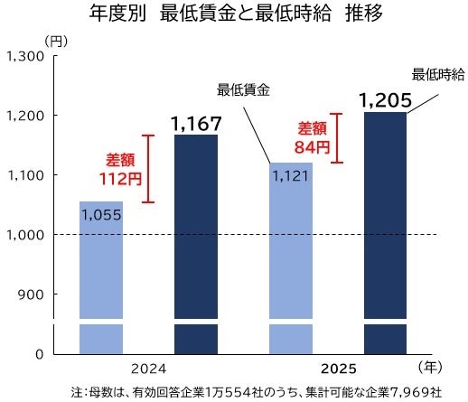 また、最低時給と最低賃金の差額に注目すると、2025年は84円であり、前回調査の112円よりも28円低下した。企業は、最低賃金の引き上げにあわせて賃上げを継続して行っているものの、「これ以上賃金を上げると、経営が厳しくなる」(不動産、愛知県)といった声が複数聞かれ、徐々に賃上げ余力が低下している様子がうかがえる。