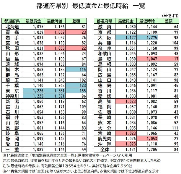 一方で、最低時給が1,000円を下回る都道府県はなかったものの、「鳥取」(1,047円)、「青森」(1,052円)、「秋田」(1,053円)、「鹿児島」(1,053円)が低水準だった。さらに、最低賃金との差額については「鳥取」(+17円)、「秋田」(+22円)、「青森」(+23円)が下位3県となっている。
