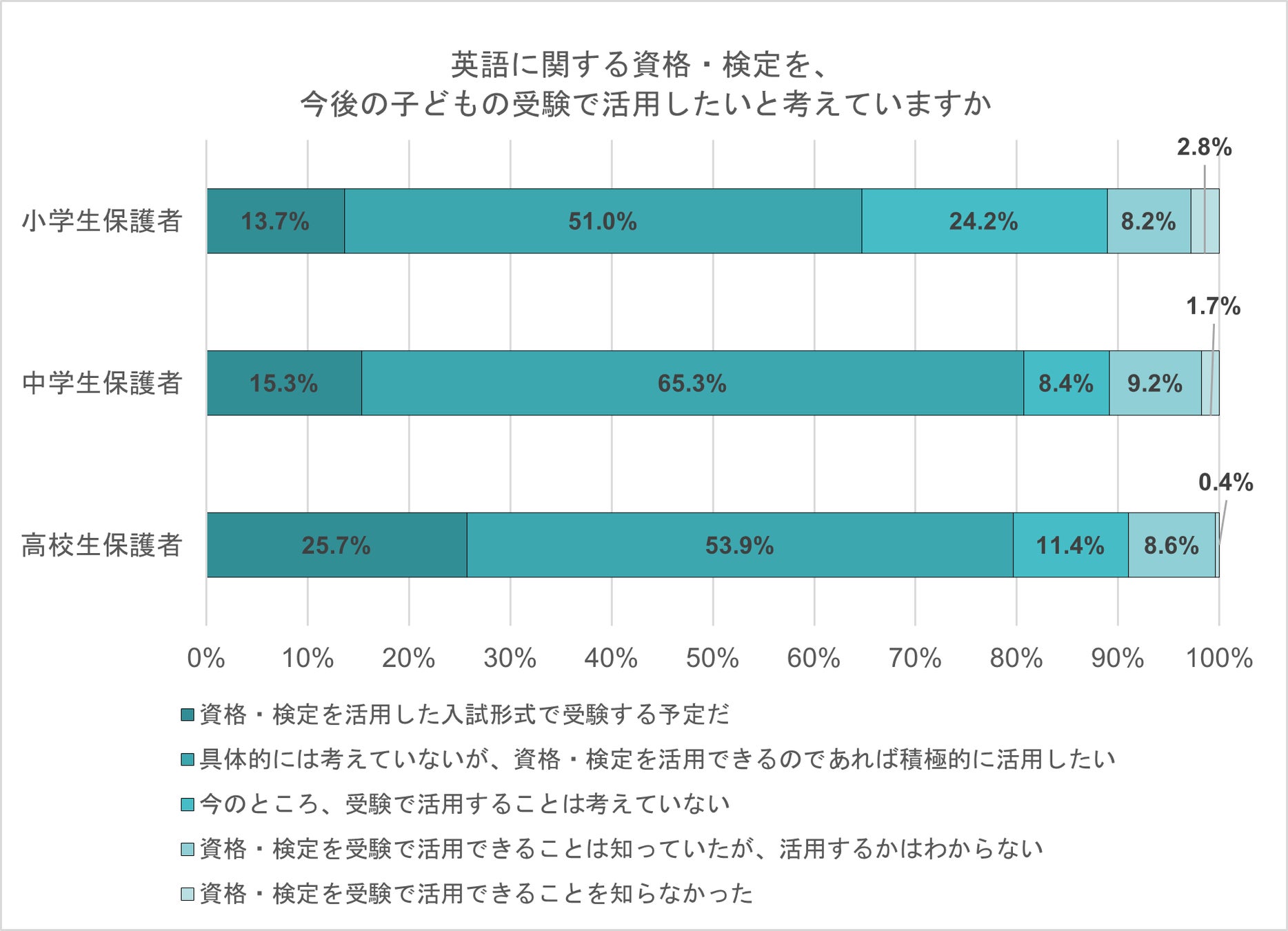 小学生では、「活用することは考えていない」という回答が中学生保護者・高校生保護者と比べて多かった。近年、中学受験でも英語の資格・検定を活用できる入試形式が増えているが、従来の国語・算数・社会・理科の4教科入試が一般的であり、また、入試で活用できる資格・検定のスコア・級に基準が設けられている場合も多い。そのため、入試に活用するために英語の資格・検定を取得している小学生の家庭はあまり多くないと考えられる。