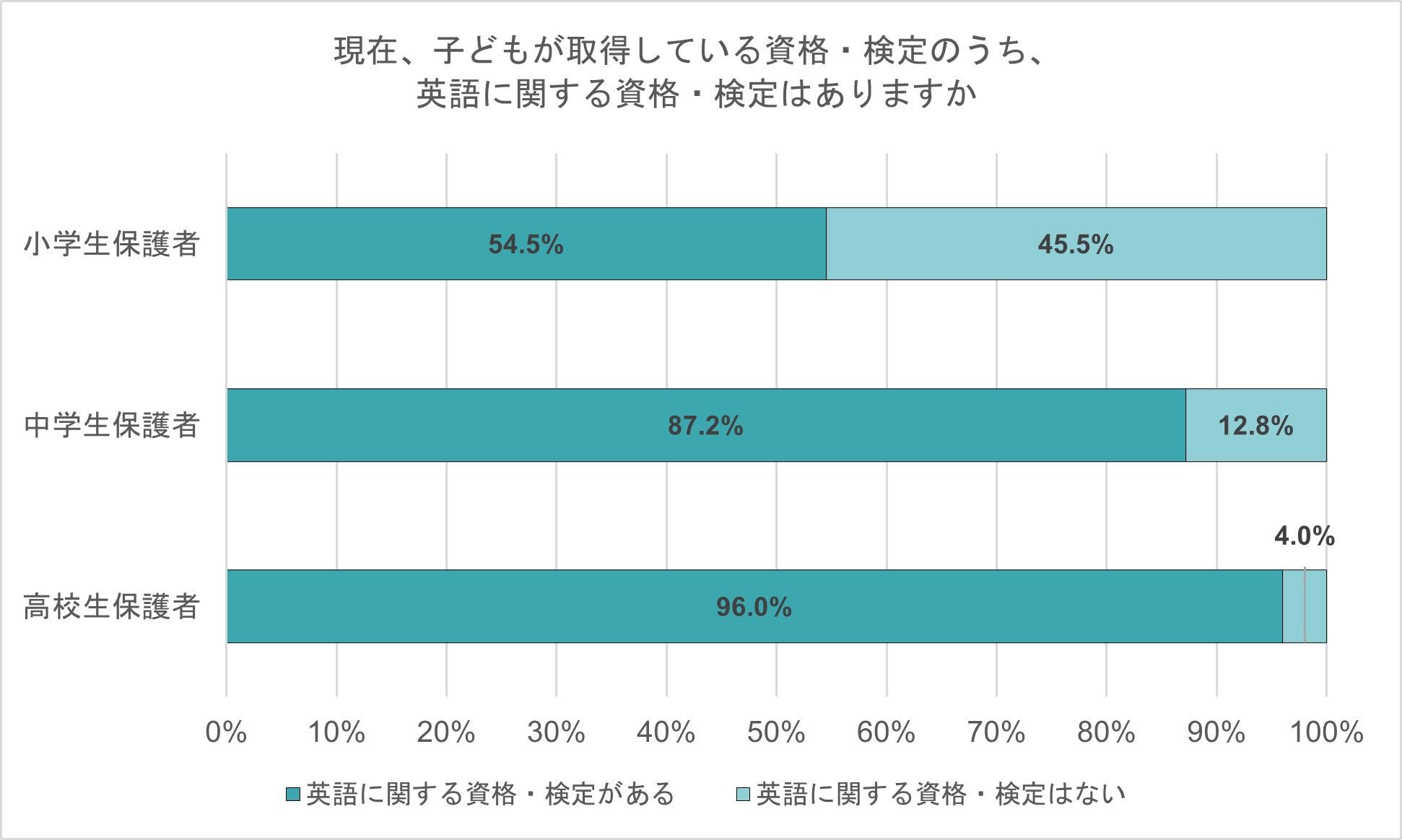 小学生保護者の54.5%、中学生保護者の87.2%、高校生保護者の96.0%が「英語に関する資格・検定がある」と回答した。小学校では、英語を教科として学習するのは小学5・6年生の2学年のみだが、半数以上の小学生が英語に関する資格・検定を取得していて、英語学習を早期から始めている小学生も少なくないのではないかと考えられる。