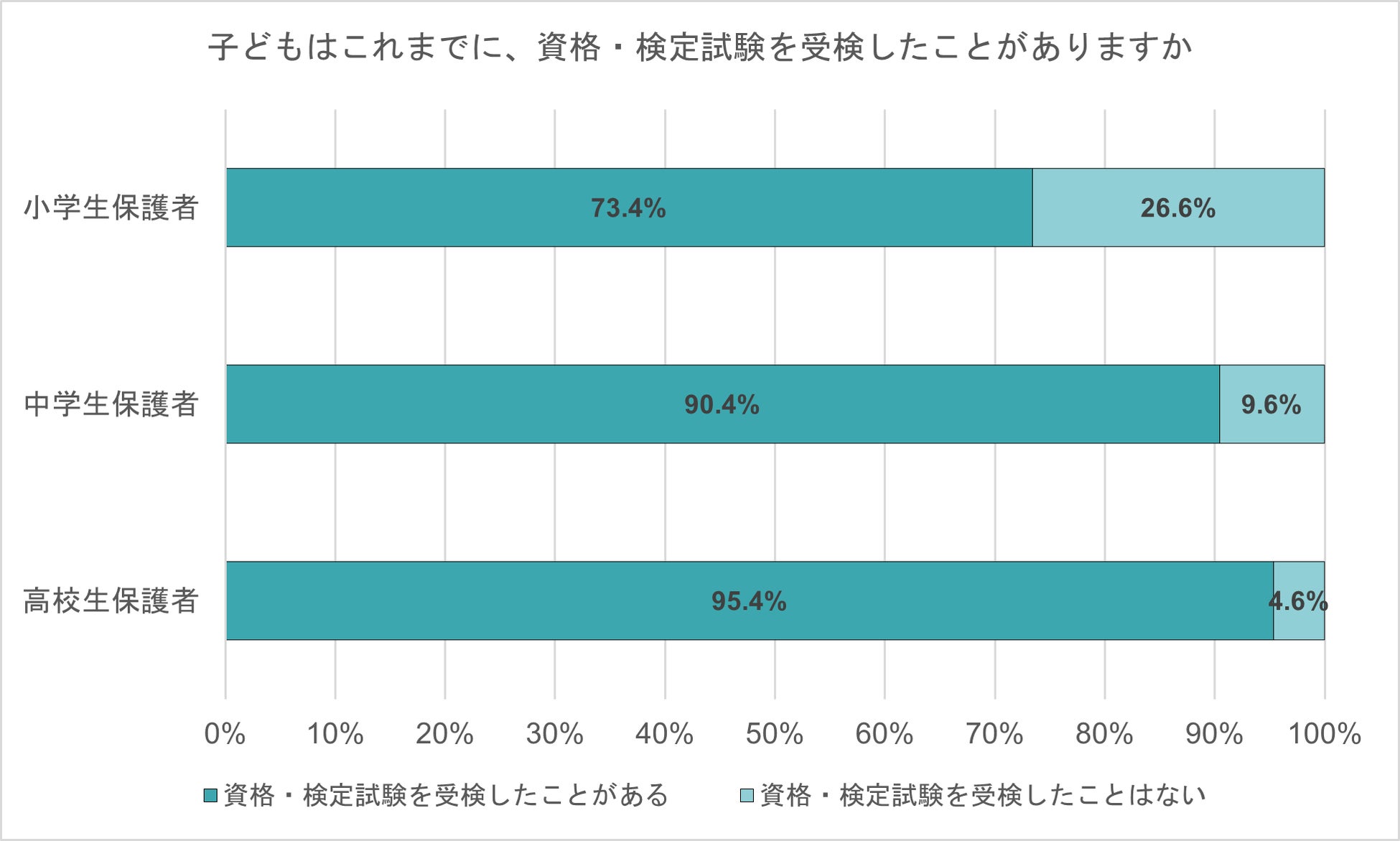 小学1年生~高校3年生の保護者に、子どもの資格・検定試験の受検経験について聞いた。高校生保護者・中学生保護者の9割以上が、子どもが「資格・検定試験を受検したことがある」と回答し、小学生保護者でも7割以上にのぼった。