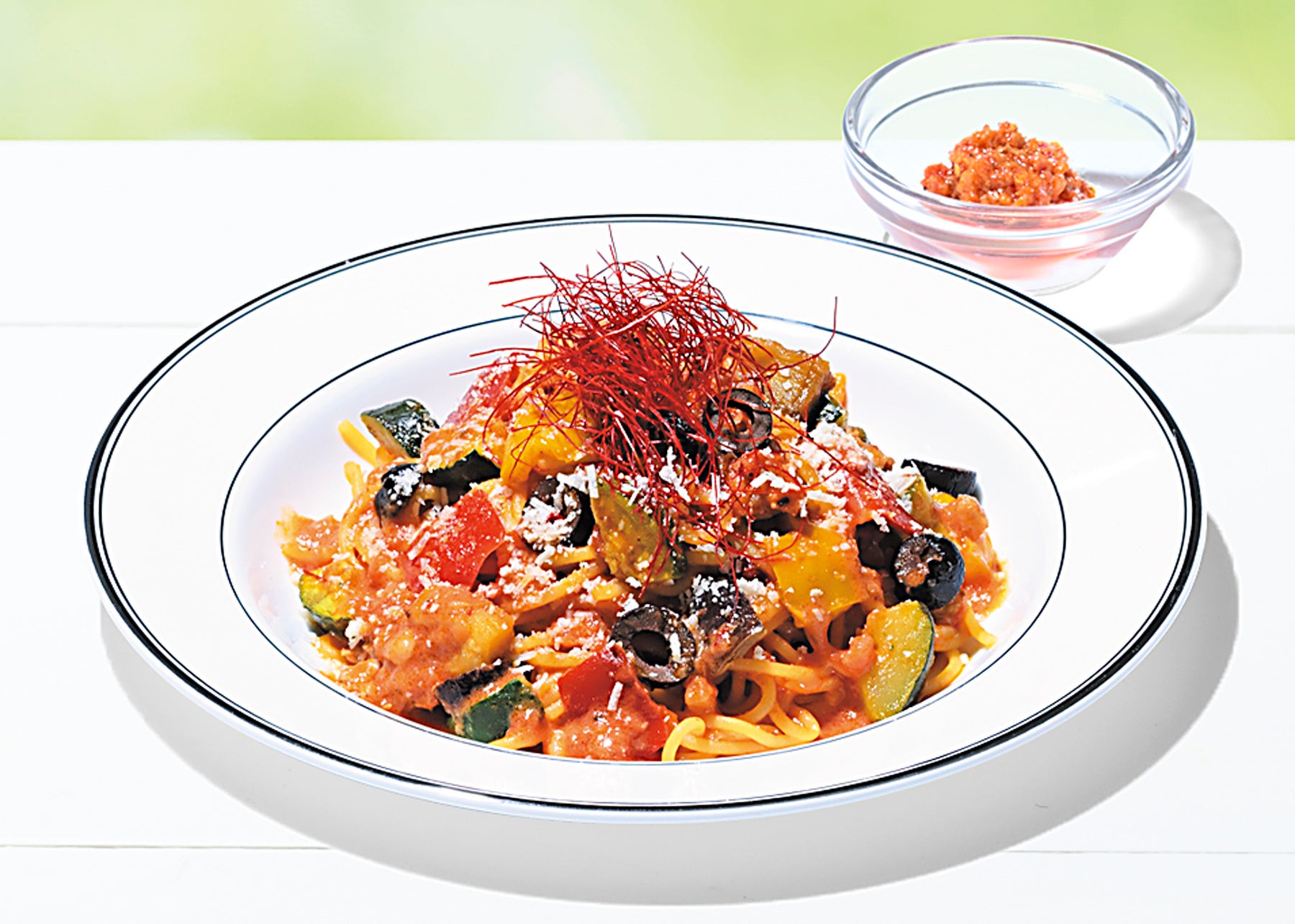 夏野菜と粗挽き香味ポークのトマトパスタ~別添え辛味ソース~