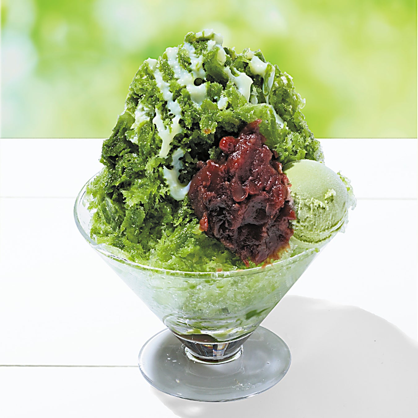 特長:ふんわりと削ったかき氷に、ほんのり渋みのある宇治抹茶シロップをかけ、なめらか食感の抹茶アイスクリーム、ふっくら炊きあげた小豆あん、練乳をトッピングしました。