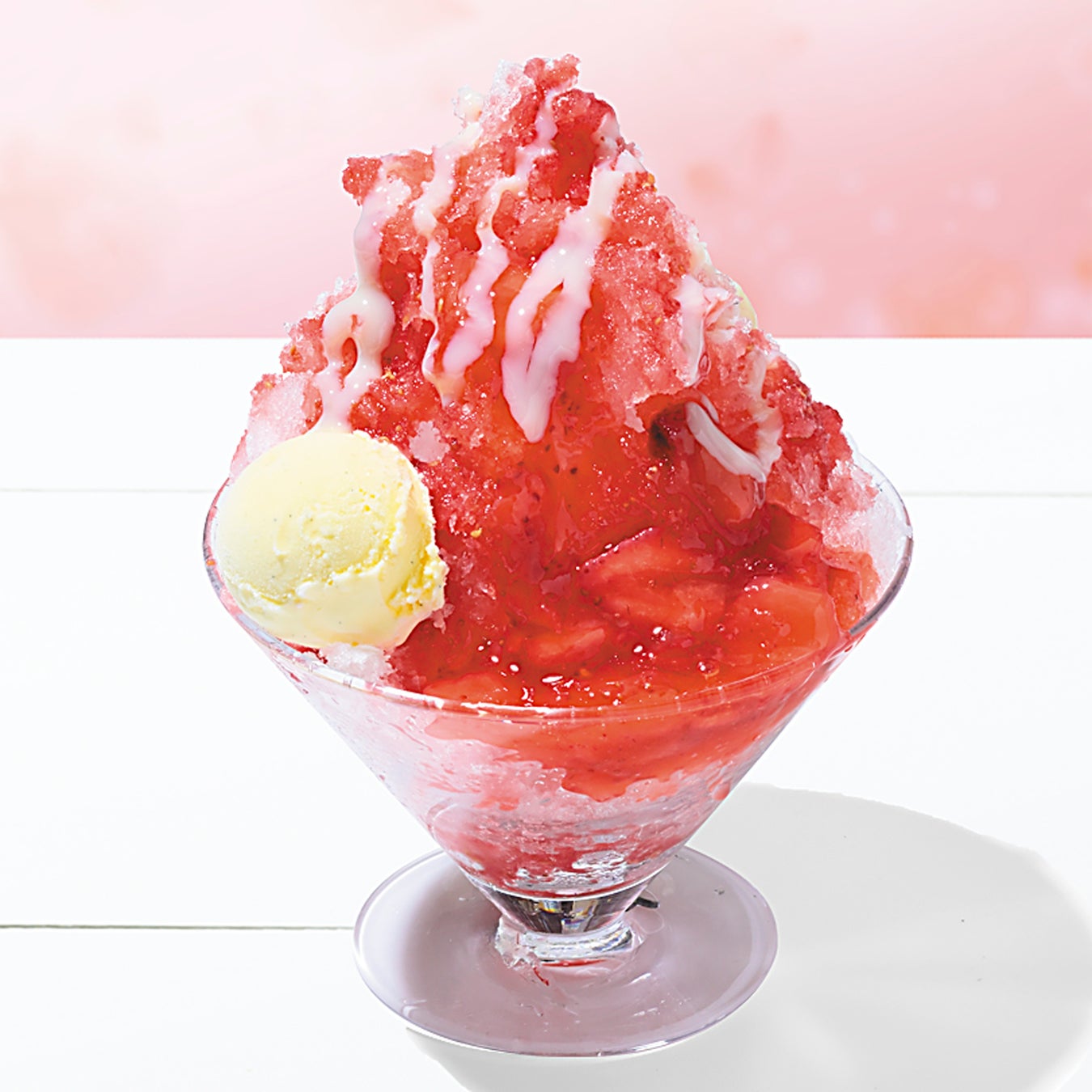 特長:ふんわりと削ったかき氷に、国産苺の香り良いソースと果肉入りソースを重ね、バニラアイスと練乳をトッピングしました。苺の甘酸っぱさとバニラアイス、練乳がとけ合い、まろやかな「いちごみるく」の甘さが口の中に広がります。