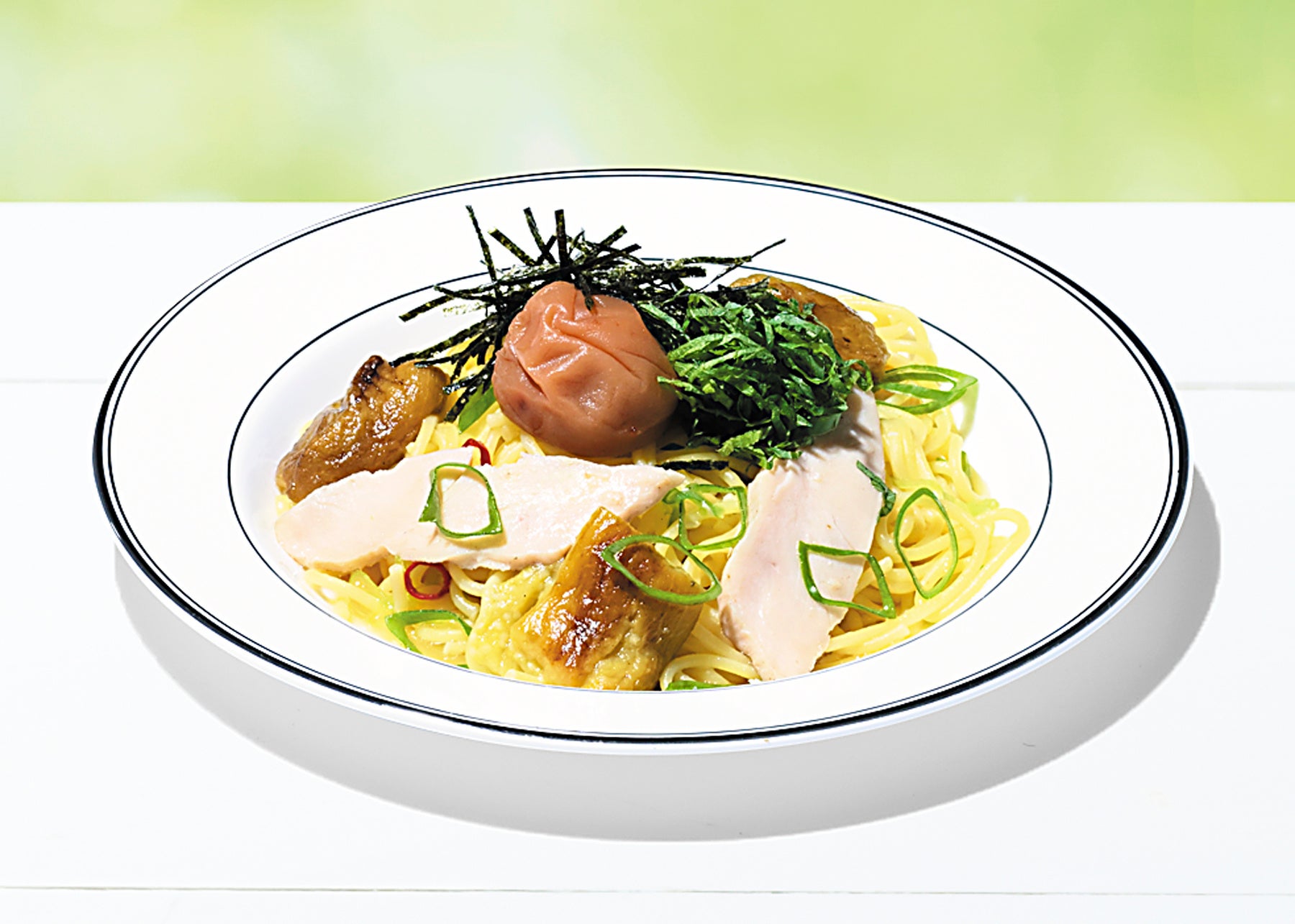 特長:炒めた分葱(わけぎ)に隠し味の魚醤を加えた旨味たっぷりのソースが、焼き茄子の香ばしい風味や蒸し鶏の味わいを引き立てます。南高梅をパスタに和えながら、大葉や海苔と絡み合うおいしさもお楽しみください。