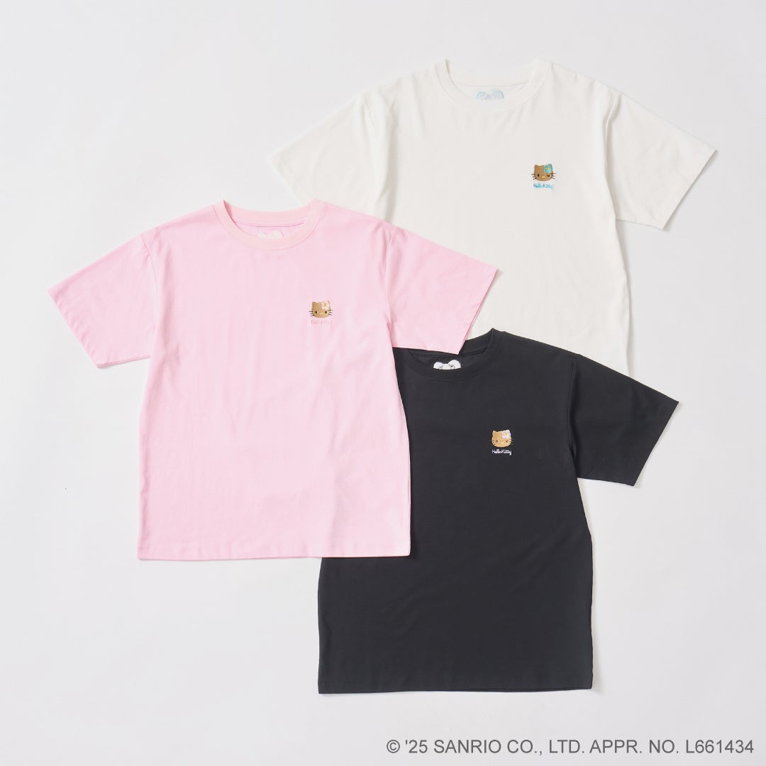 左胸に、ごきげんな表情の「ハローキティ」のフェイスが刺繍されたデザインと、バックスタイルにインパクトのあるプリントをあしらったデザインをラインアップしています。