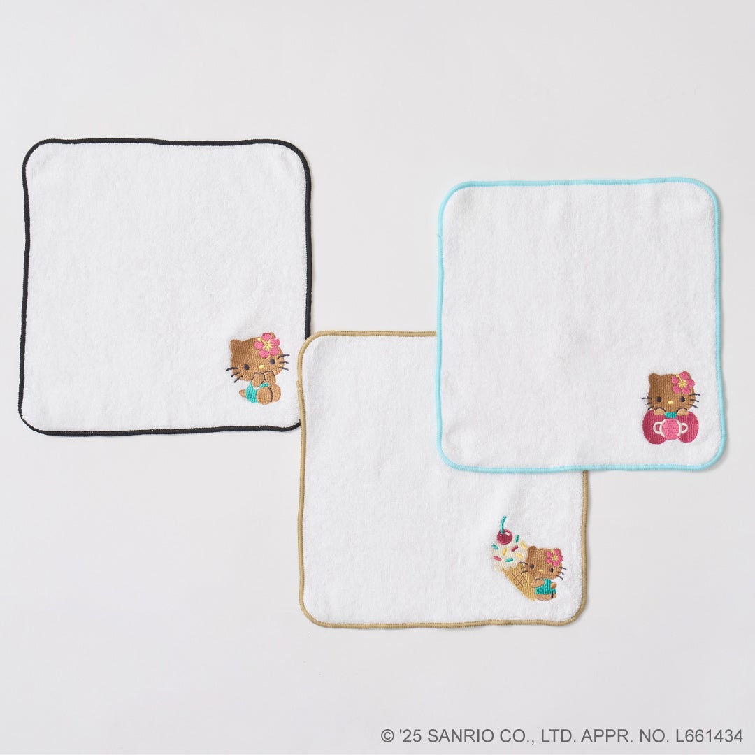 夏らしい日焼けした「ハローキティ」の刺繍がポイントのタオルハンカチ。さまざまな表情を楽しめるアソート柄での展開です。