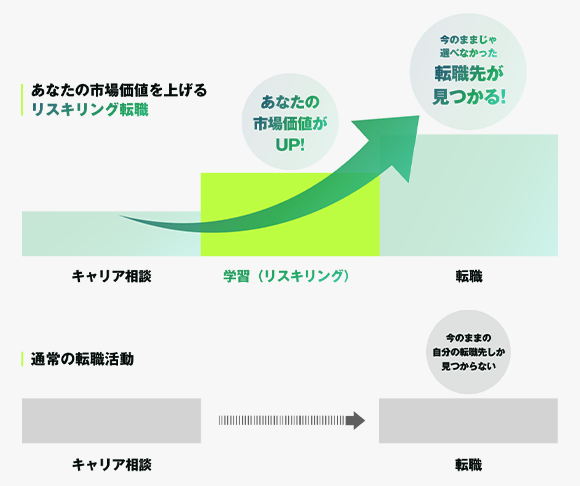 通常の転職活動ではこれまで培ってきた職歴やスキルをもとに転職先を探すため、現状の自分で選択可能な業界や職種への転職に限られてしまいがちです。リスキリング転職ではこれまで培ってきた職歴やスキル、そしてパーソナリティや価値観にプラスして最適なリスキリング(学習)を行うことにより、通常の転職活動では選択肢になかった新しいキャリアを選択することが可能になります。