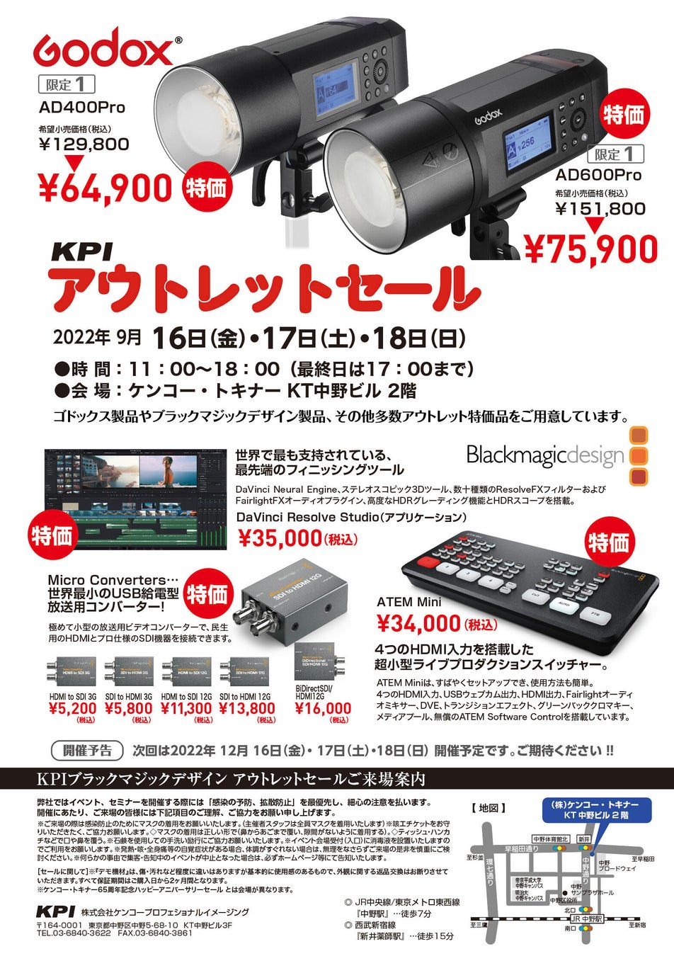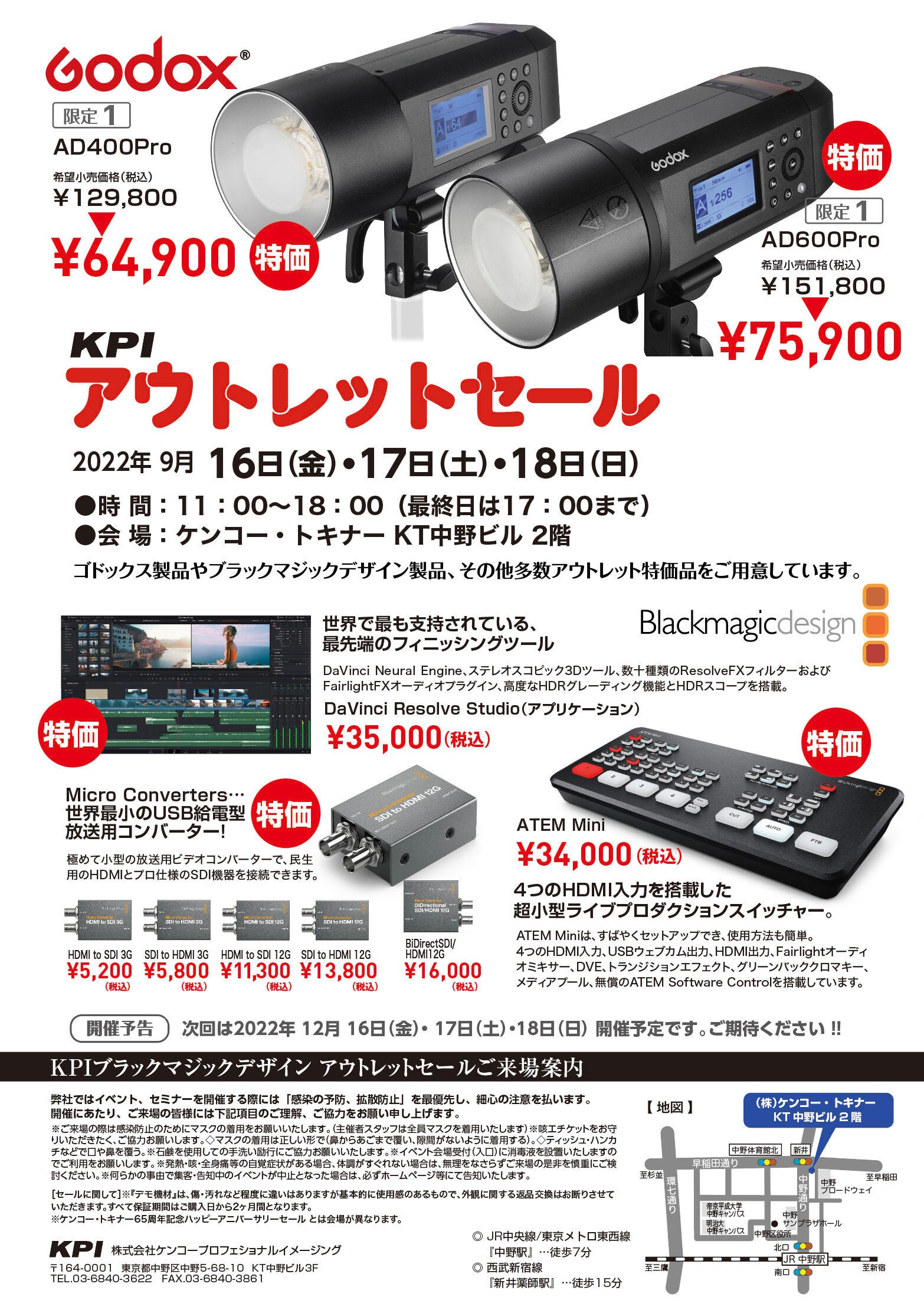 株式会社ケンコー・トキナー(本社:東京都中野区 代表取締役社長 山中 徹)は、株式会社ケンコープロフェショナルイメージングと合同で、ケンコー・トキナーKT 中野ビル(東京都中野区中野5-68-10)にて、アウトレットセールを2022年9月16日(金)~18日(日)に開催いたします。(16日はケンコープロフェショナルイメージングのみ開催)ケンコー・トキナーでは、創業65周年を迎え「65周年記念ハッピーアニバーサリーセール」として、いつもにも増して、多くの製品を取り揃えます。