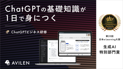 ChatGPTビジネス研修は、ChatGPTを活用した業務効率化を体験しながら学べるICT教材です。(第20回日本e-Learning大賞「生成AI特別部門賞」を受賞 ※1)