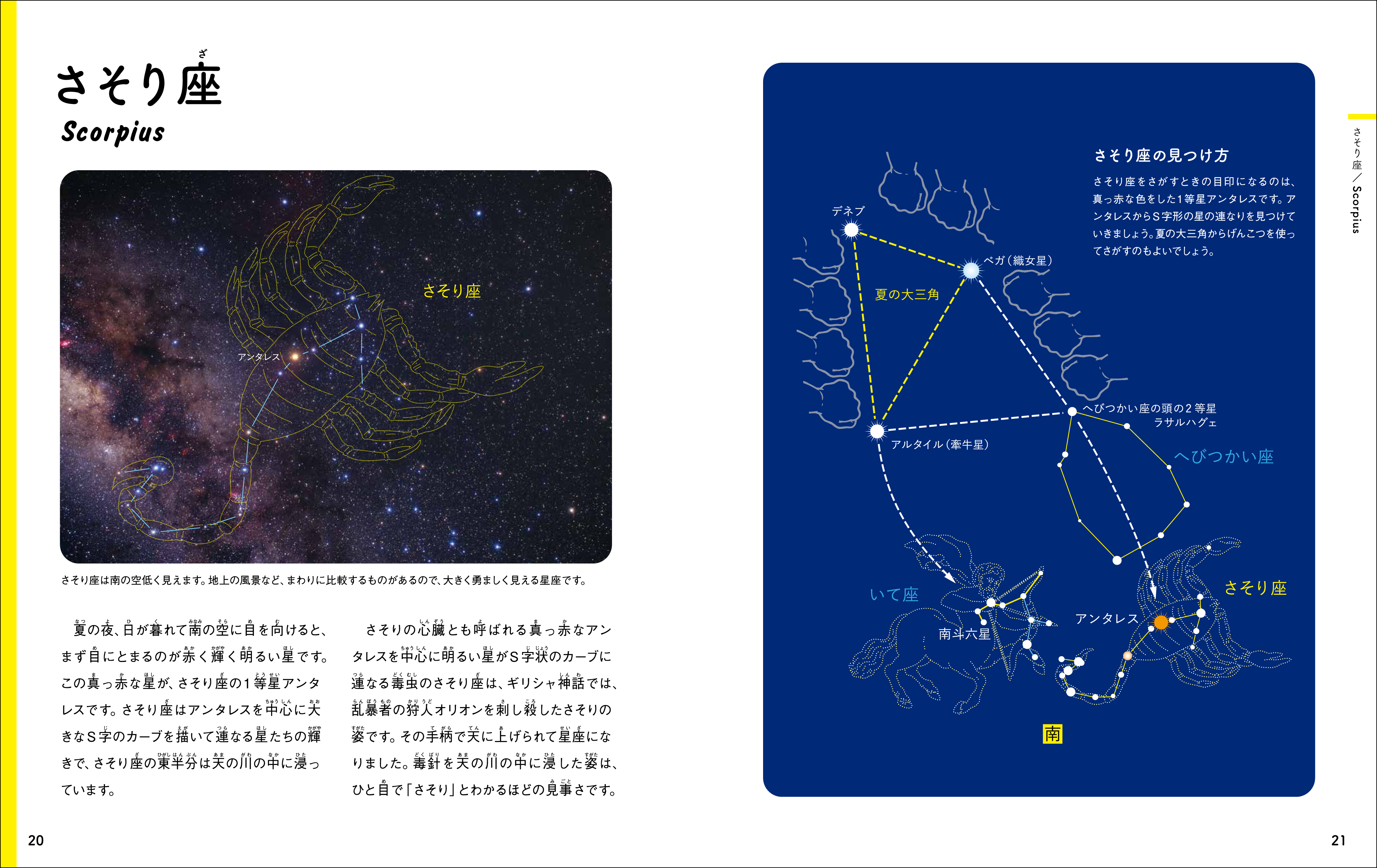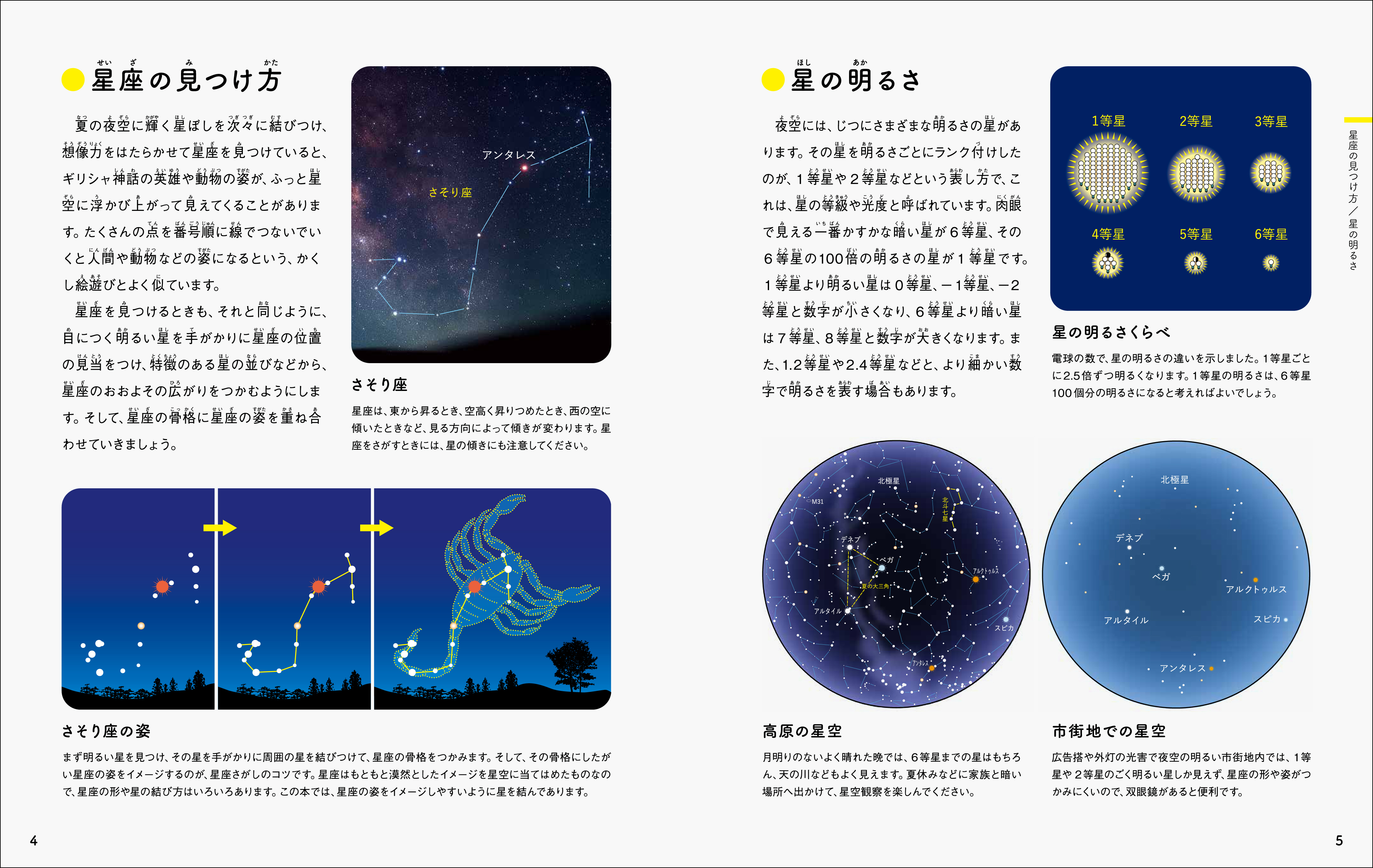 ●さそり座(アンタレスの正体/同時に姿を見せない、さそり座とオリオン座)/いて座(夏の天の川を見よう)/たて座/てんびん座/ヘルクレス座/りゅう座/へびつかい座/へび座/こと座(夏の大三角/北極星をさがす/七夕の伝説)/わし座/はくちょう座(北十字と南十字)/や座/こぎつね座/いるか座/みなみのかんむり座(南の地平線近くに見える星座)